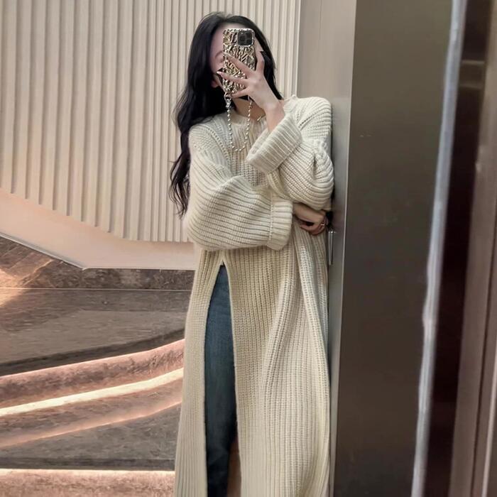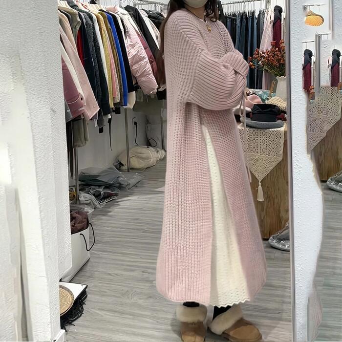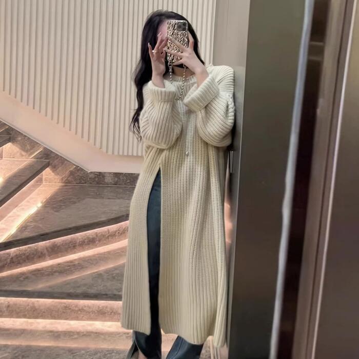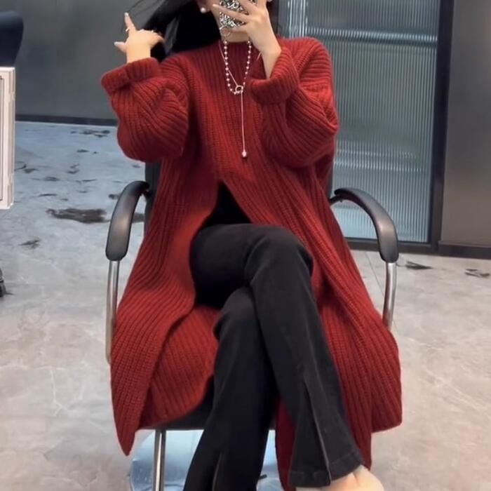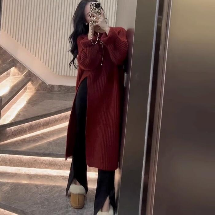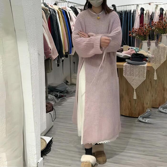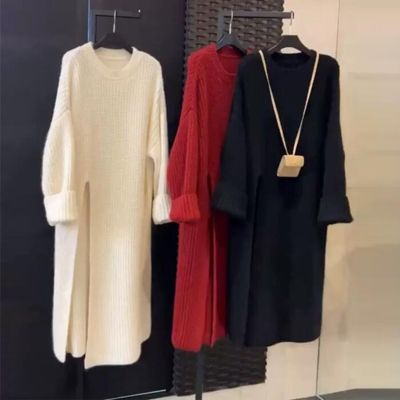 全4色 大きいサイズ 体型カバー ゆったり トップス ニット ワンピース チュニック ロングニット スリット レディース エレガント きれいめ カジュアル 長袖 ロング丈 大人 可愛い フェミニン レイヤード 重ね着 レッド 赤 ピンク ブラック 黒 ホワイト 白 春 秋 冬 20代 30代 40代 50代