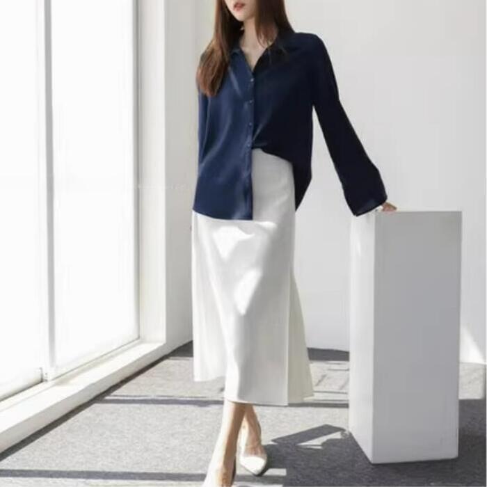 全2色 大きいサイズ トップス シャツ ブラウス シフォン 羽織り レディース エレガント きれいめ カジュアル 長袖 大人 可愛い フェミニン シンプル ゆったり 体型カバー シンプル 楽ちん 通勤 オフィス ナチュラル 青 ブルー ホワイト 白 春 秋 冬 20代 30代 40代 50代