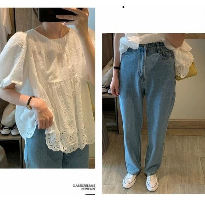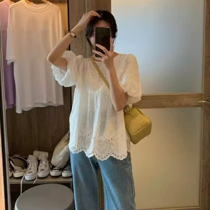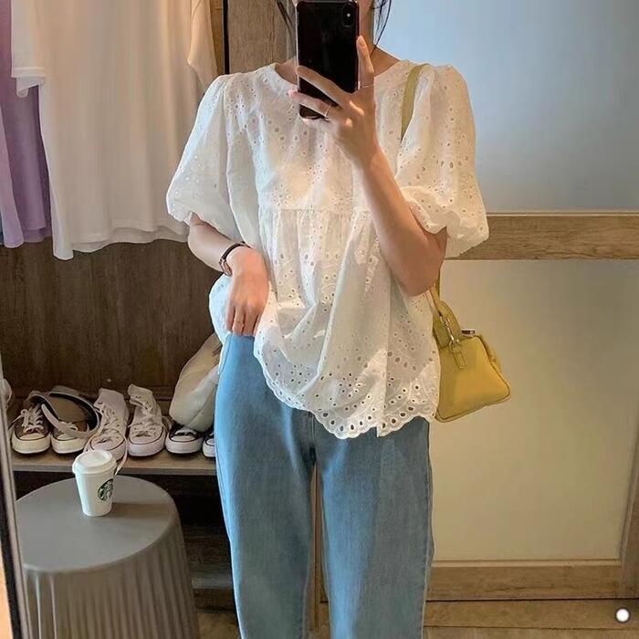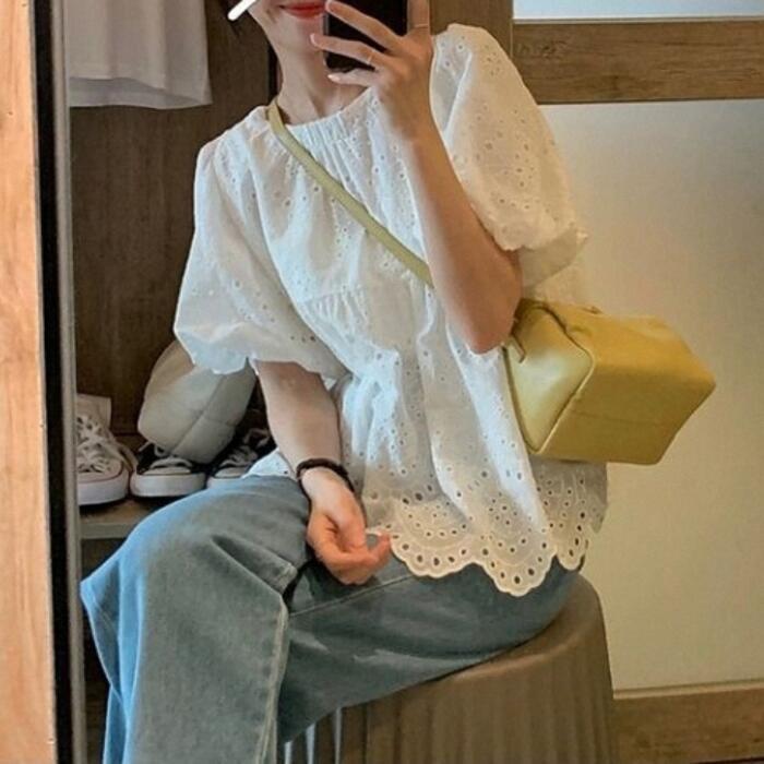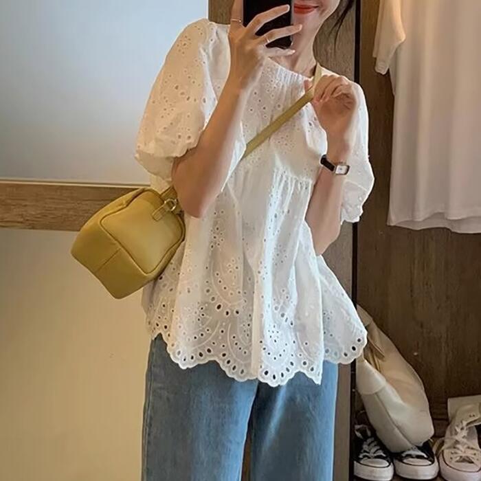 大きいサイズ パフスリーブ トップス シャツ ブラウス カットワーク レース スカラップ カットソー レディース エレガント きれいめ カジュアル 半袖 大人 可愛い フェミニン 体型カバー ナチュラル ゆったり ホワイト 白 春 秋 夏 20代 30代 40代 50代