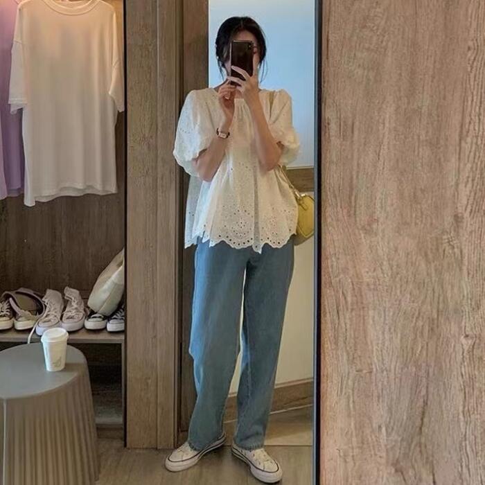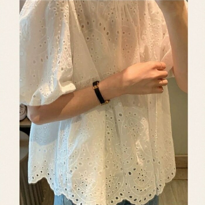 カットワークレースがナチュラルな雰囲気の半袖ブラウス。