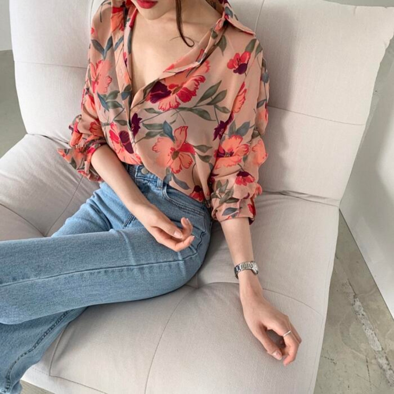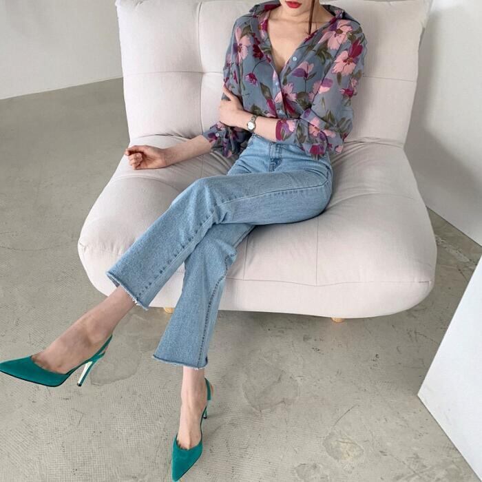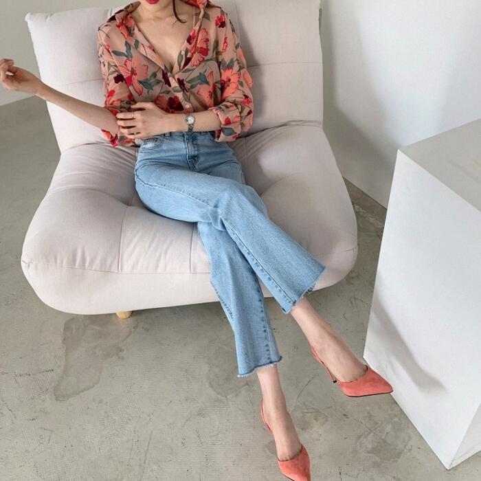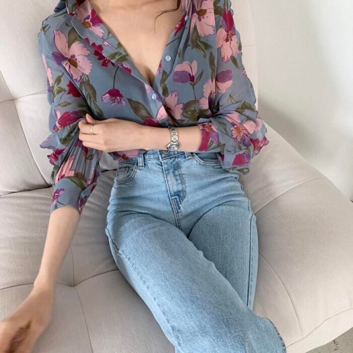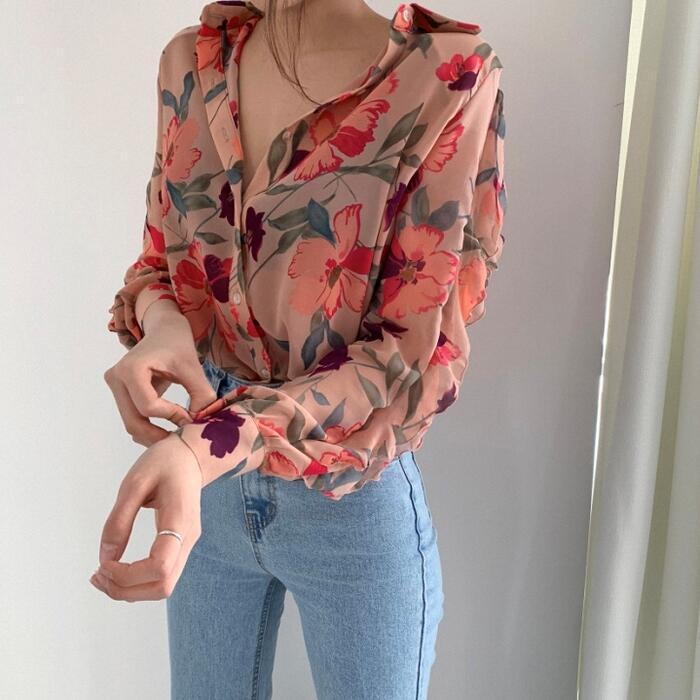 クラシカルな花柄プリントが目を惹くシフォンブラウス。