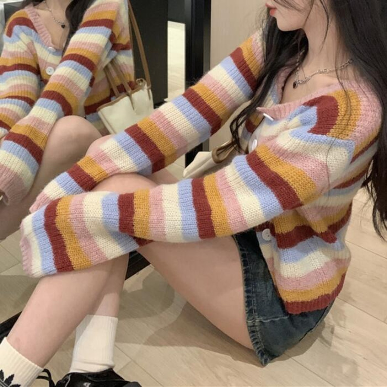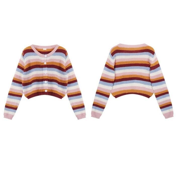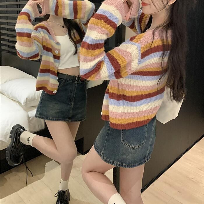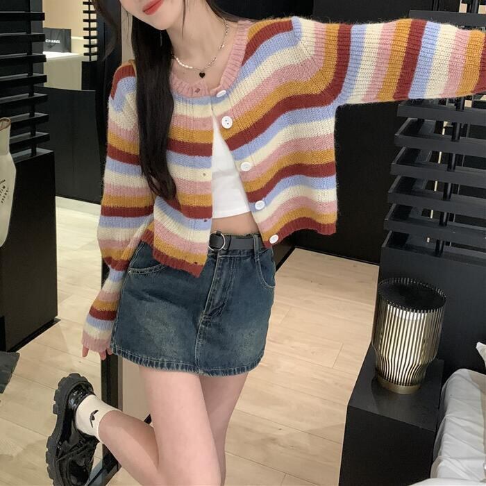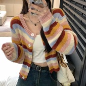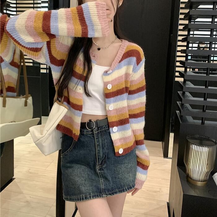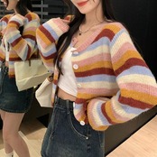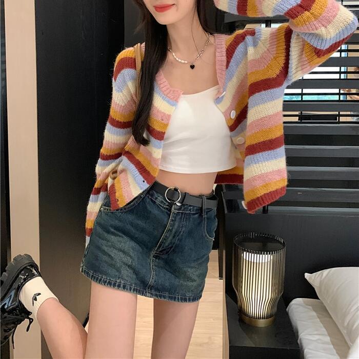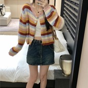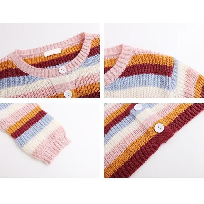 マルチカラーのボーダー柄カーディガン。