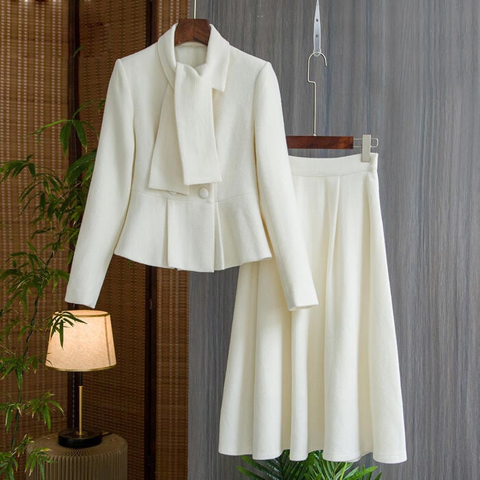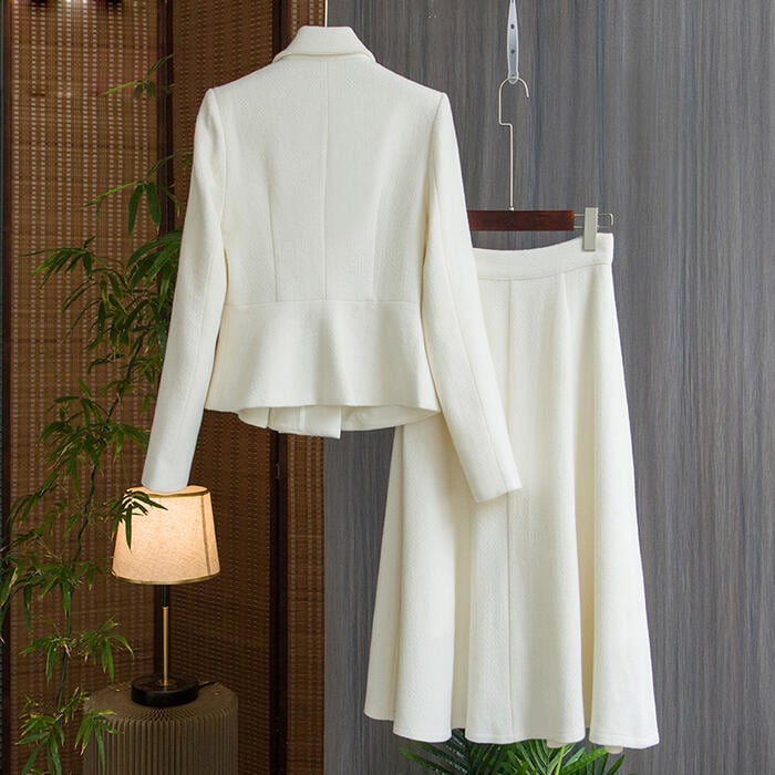 ペプラムデザインのトップスとスカートのセットアップ。