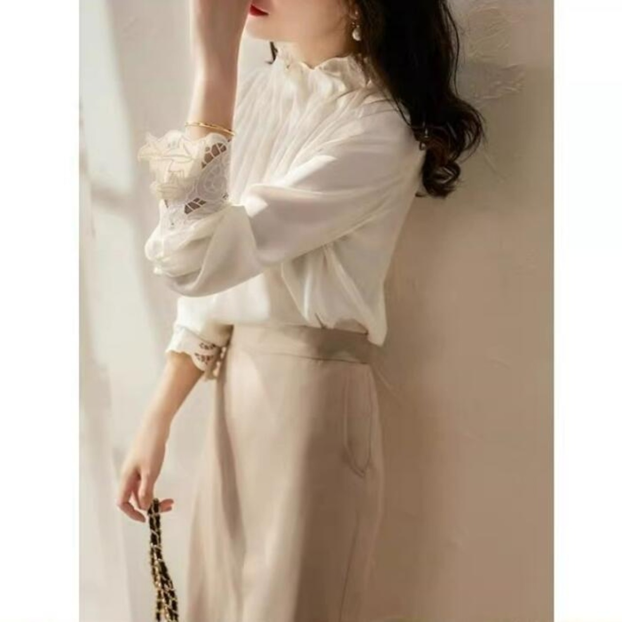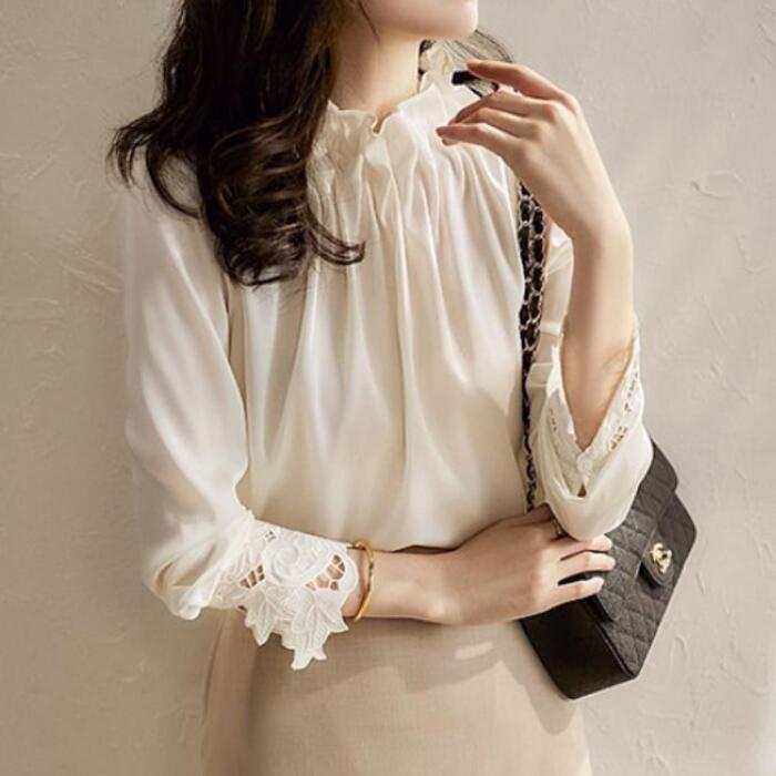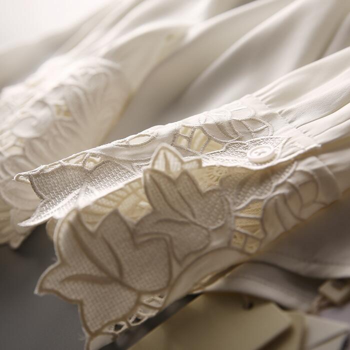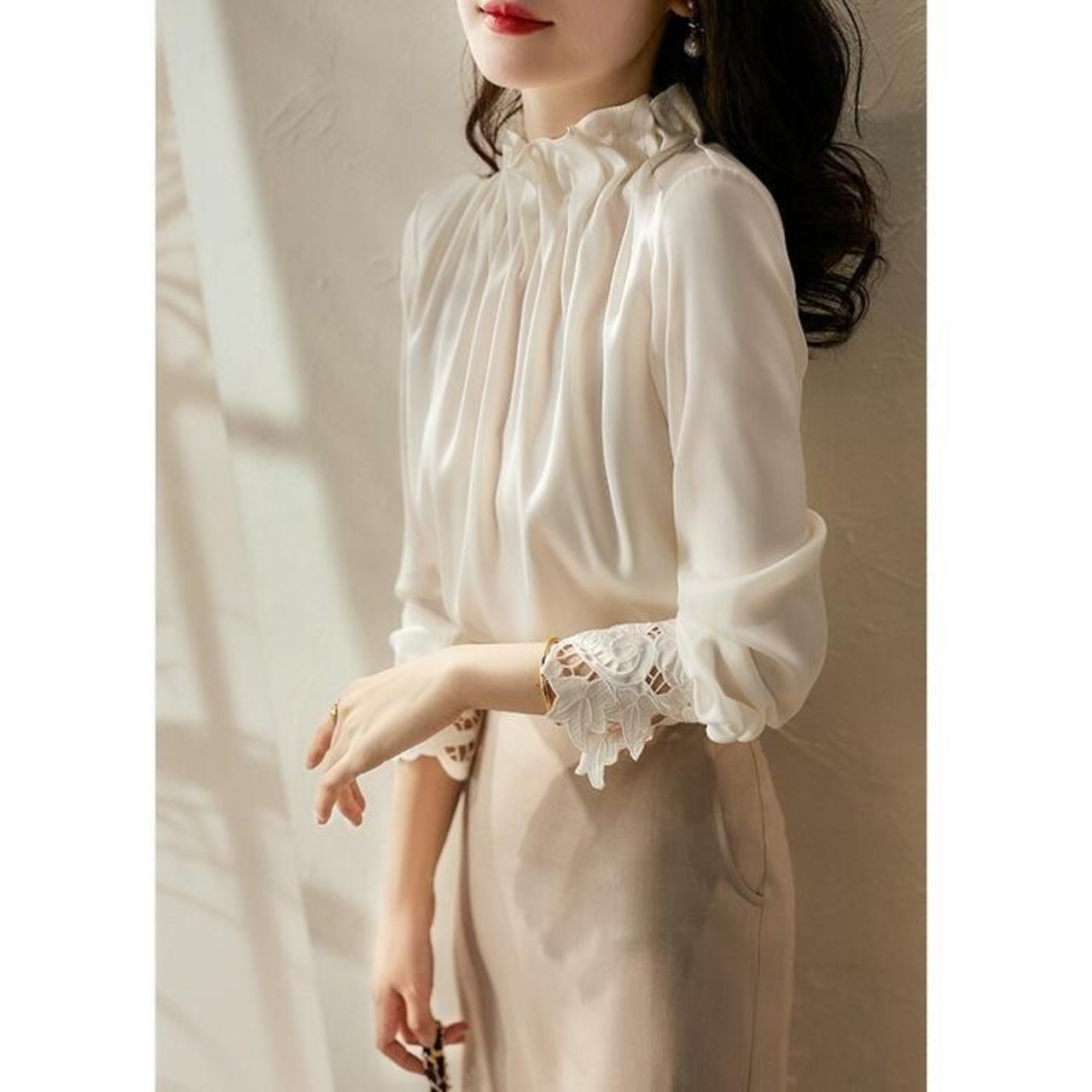 首元のボリュームや袖口のレースなど、華やかなポイントを効かせたデザイン。