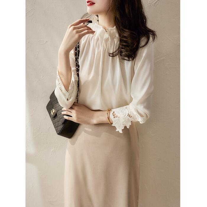 大きいサイズ 体型カバー トップス ブラウス シャツ プルオーバー カットソー ハイネック レース レディース エレガント きれいめ カジュアル 長袖 フェミニン 大人 可愛い ドレープ 抜け感 こなれ感 通勤 オフィス キレカジ ベージュ 春 秋 冬 20代 30代 40代 50代