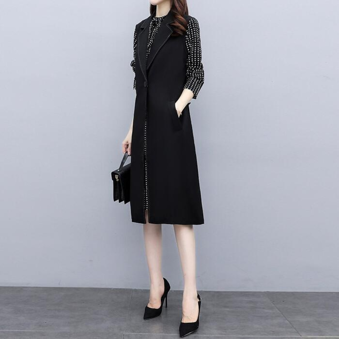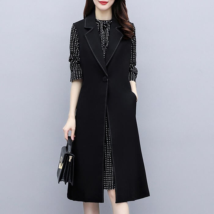 ドット柄ワンピースとロングベストのセット。