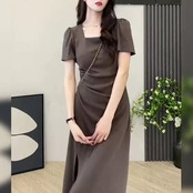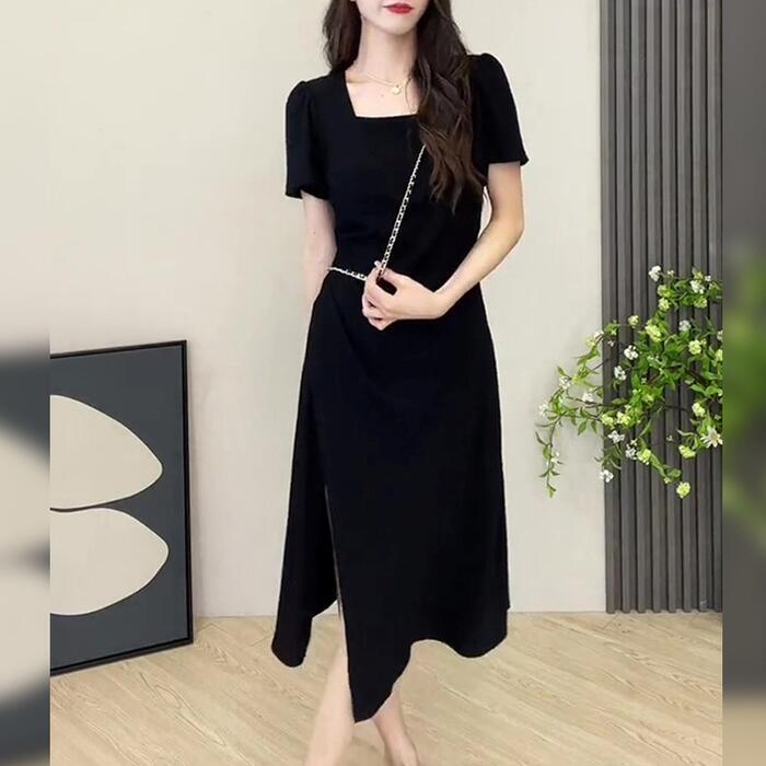 全2色 大きいサイズ 体型カバー ワンピース ワンピ ドレス 袖あり レディース エレガント きれいめ カジュアル 半袖 大人 可愛い スクエアネック フェミニン ミモレ丈 スリット Aライン ギャザー おしゃれ シンプル ブラウン ブラック 黒 春 秋 夏 20代 30代 40代 50代