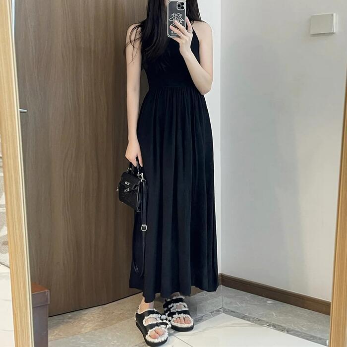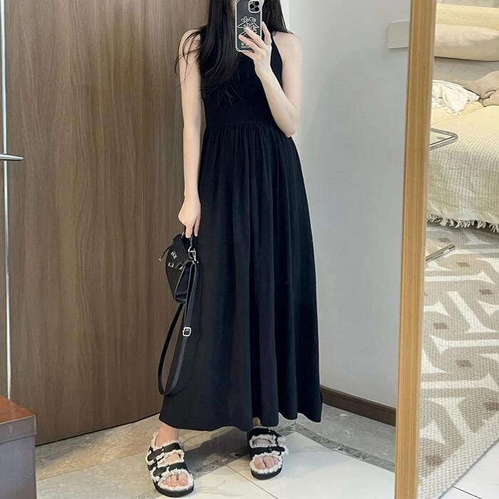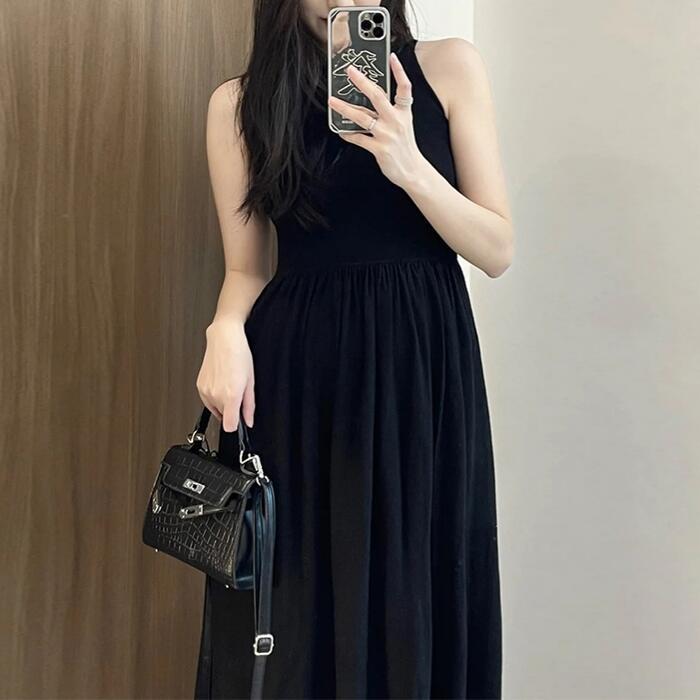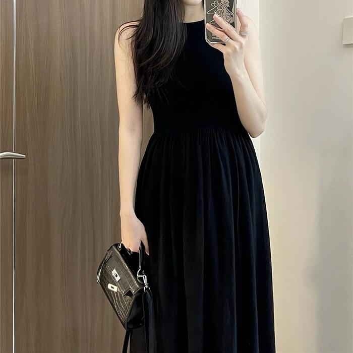 大きいサイズ 体型カバー ワンピース ワンピ ドレス ノースリーブ レディース エレガント きれいめ カジュアル シンプル 大人 可愛い フェミニン ロング丈 フレア Aライン ハイウエスト おしゃれ 切り替え ブラック 黒 春 秋 夏 20代 30代 40代 50代
