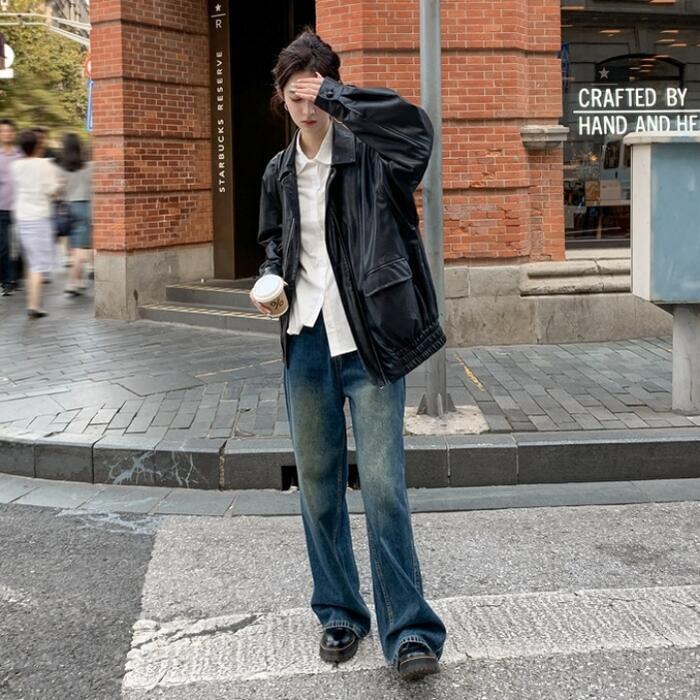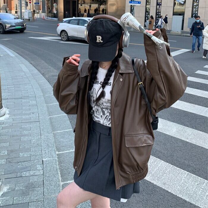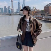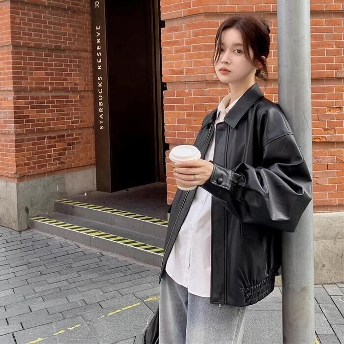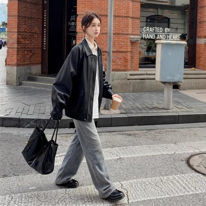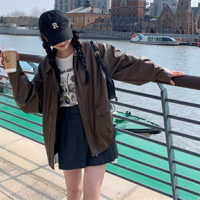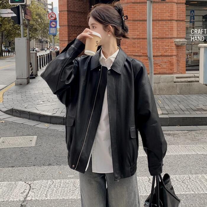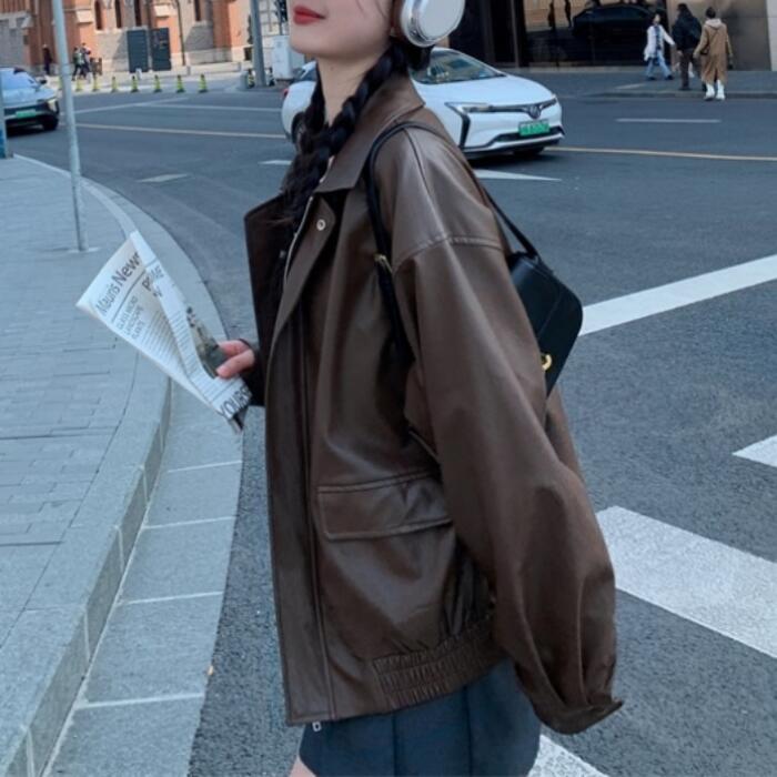 全2色 体型カバー ゆったり アウター コート ジャケット ブルゾン フェイクレザー 革ジャン レディース エレガント きれいめ カジュアル 大人 可愛い フェミニン かっこいい おしゃれ ヴィンテージ オーバーサイズ ブラウン ブラック 黒 春 秋 冬 20代 30代 40代 50代