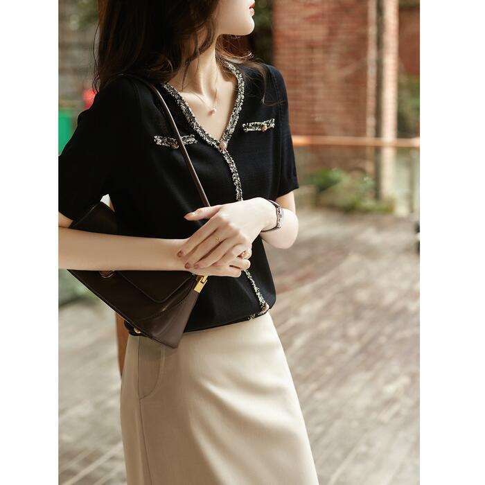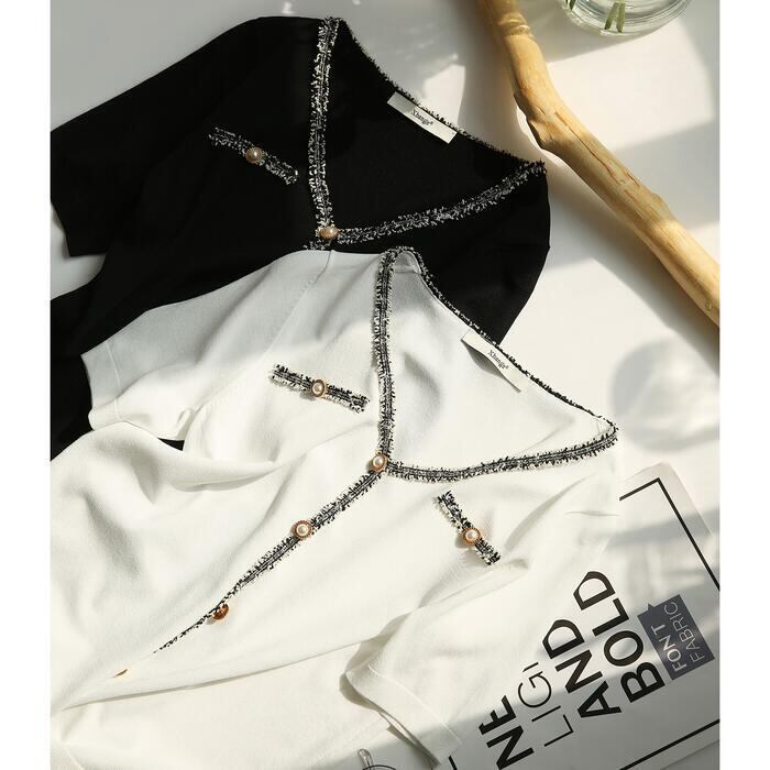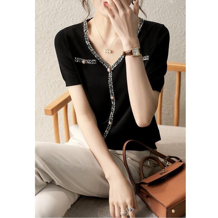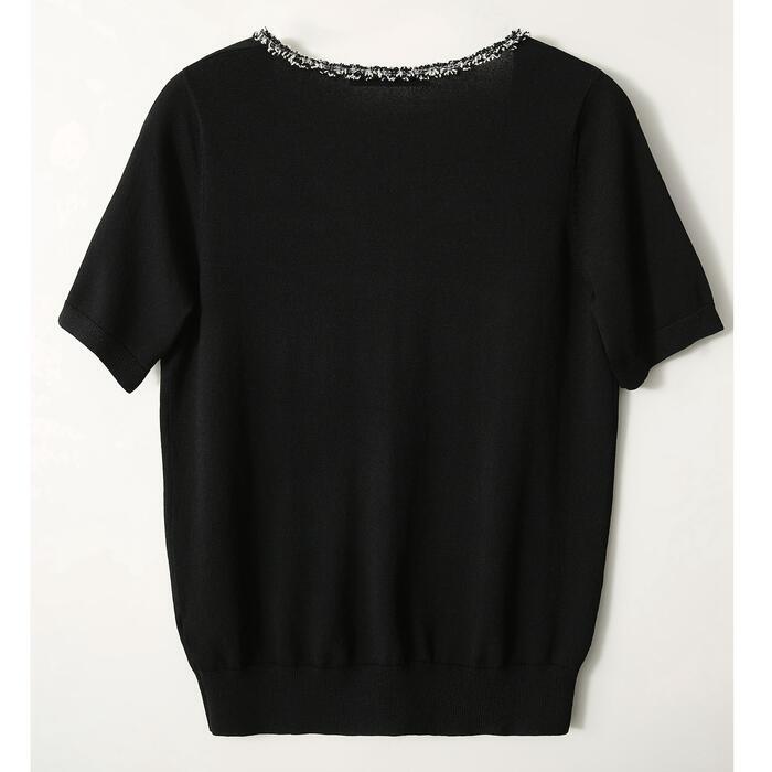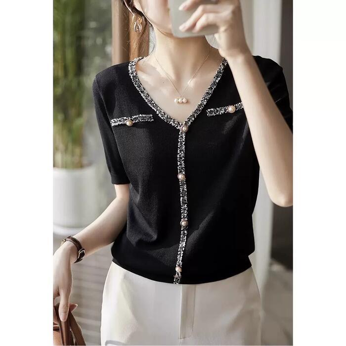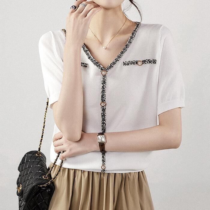 全2色 大きいサイズ 体型カバー トップス ニット カットソー レディース プルオーバー 半袖 エレガント きれいめ カジュアル フェミニン ライン パールボタン 大人 可愛い Vネック 上品 通勤 オフィス ホワイト 白 ブラック 黒 春 秋 夏 20代 30代 40代 50代
