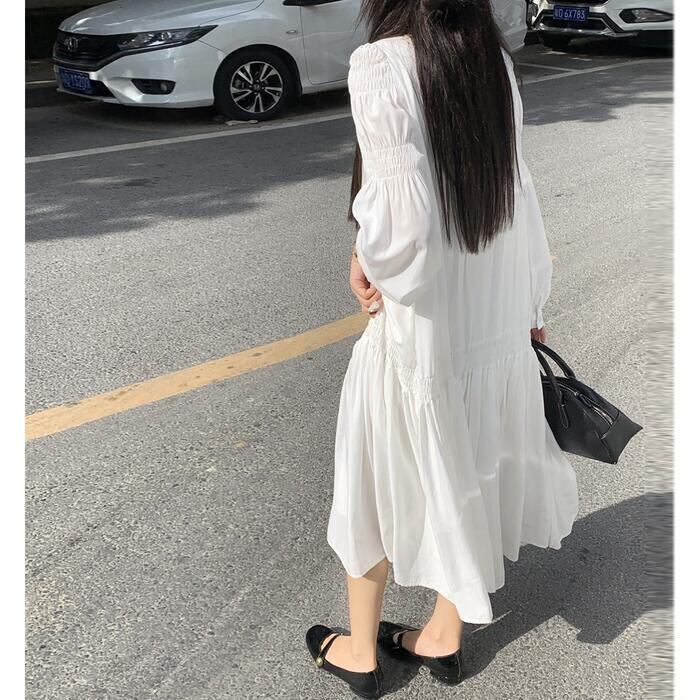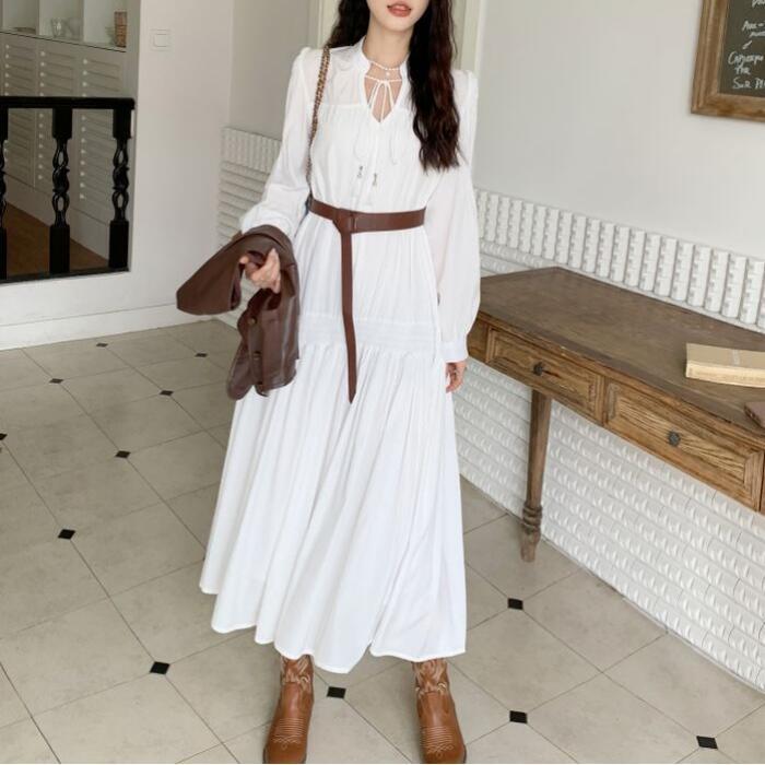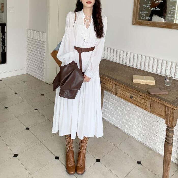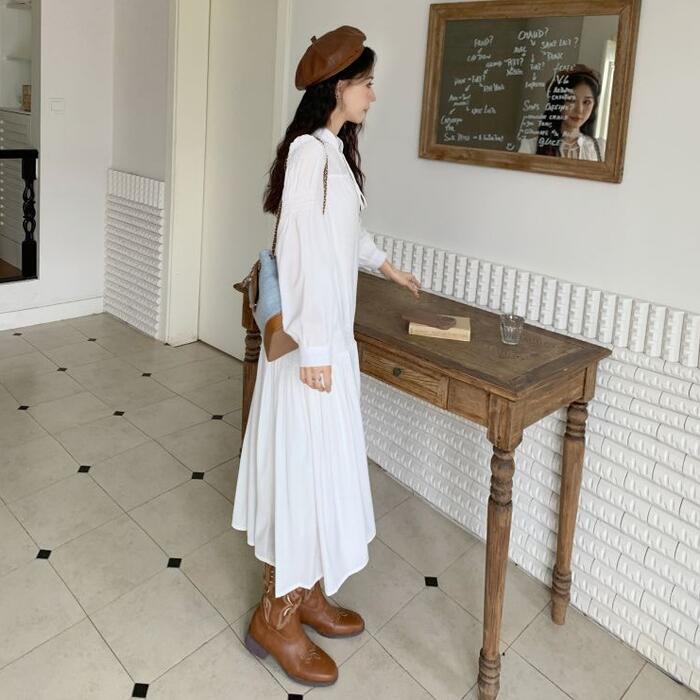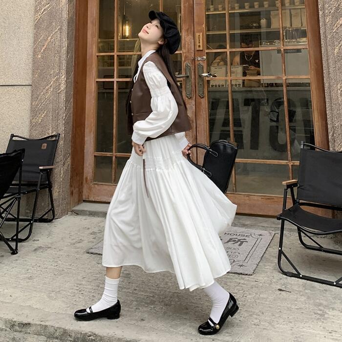 セットアップ 大きいサイズ 体型カバー ワンピース ワンピ ドレス ベスト ジレ 袖あり パフスリーブ レディース エレガント きれいめ カジュアル シンプル ナチュラル 大人 可愛い フェミニン ミモレ丈 Aライン レイヤード 重ね着 ホワイト 白 ブラウン 春 秋 夏 20代 30代 40代 50代