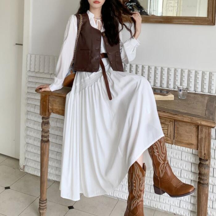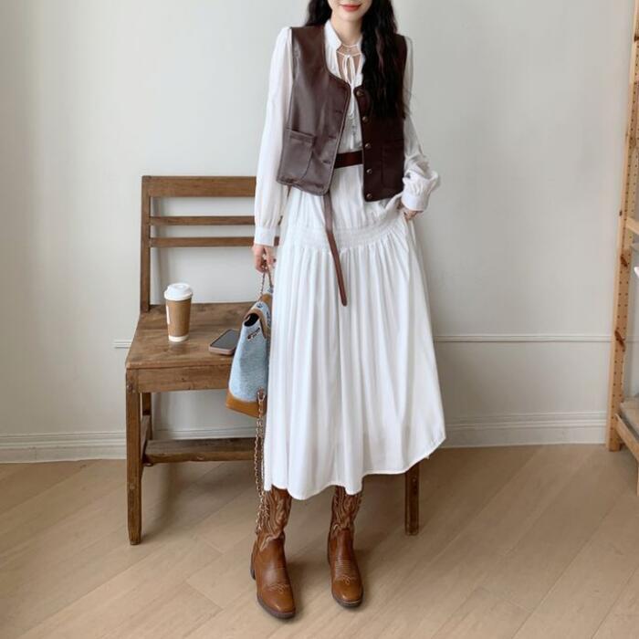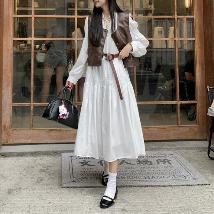 ホワイトのロングワンピースとフェイクレザーベスト。