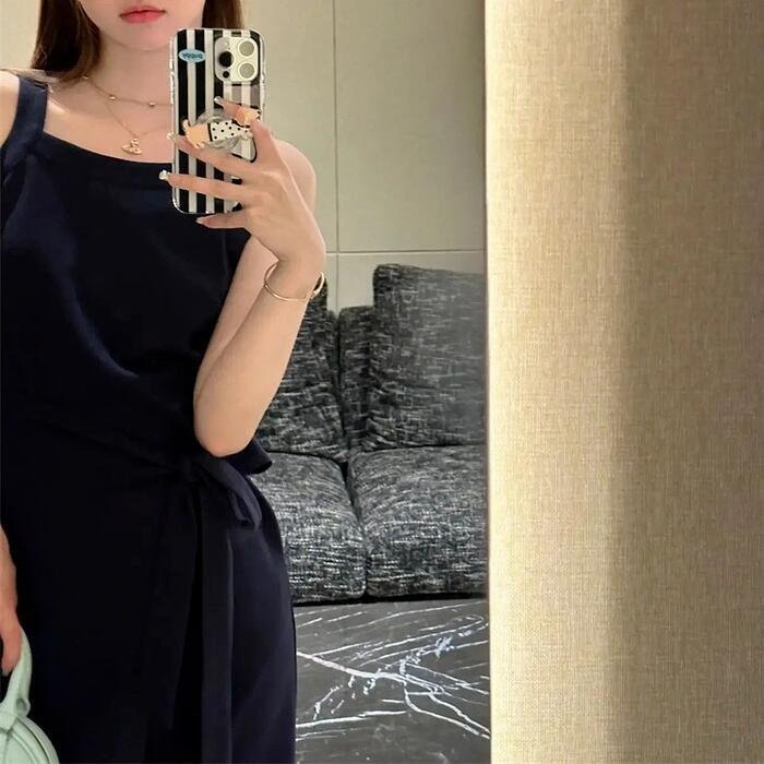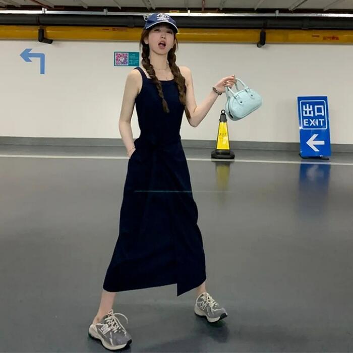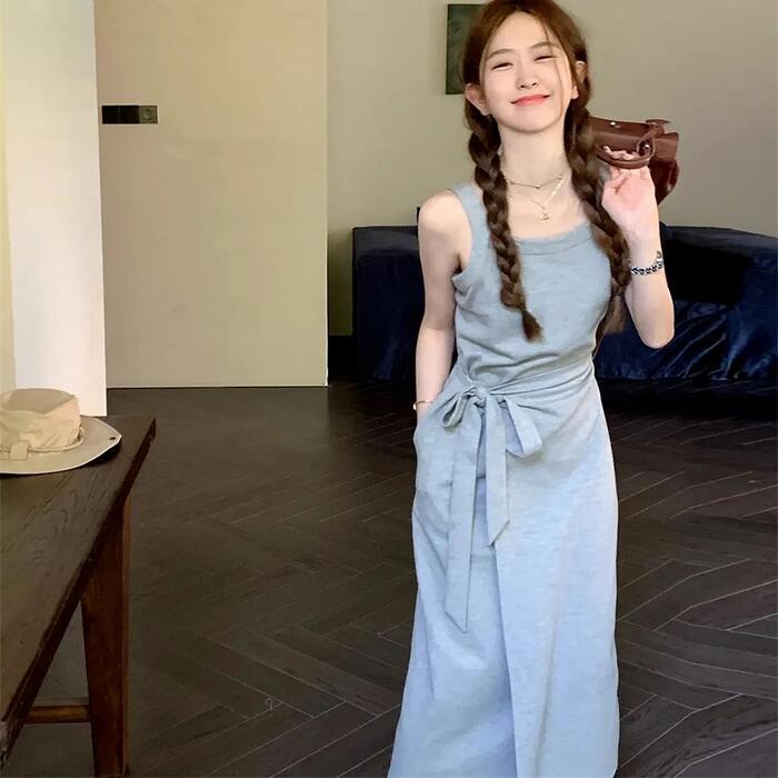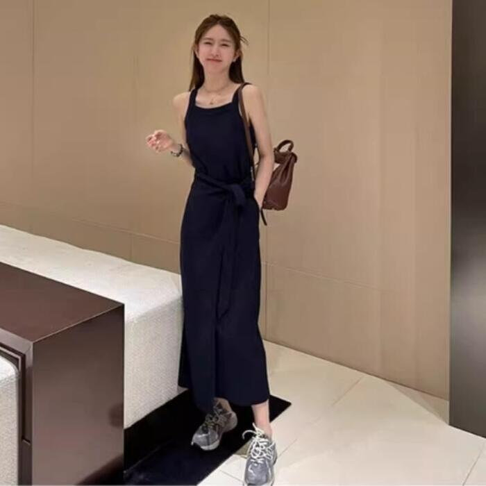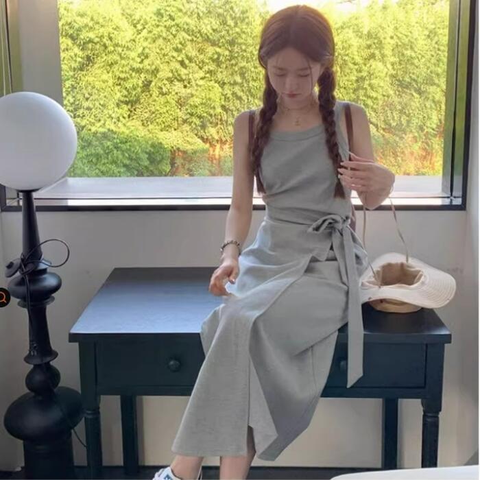 全2色 大きいサイズ 体型カバー ワンピース ワンピ ドレス ニット ノースリーブ レディース エレガント きれいめ カジュアル シンプル ラップワンピース 大人 可愛い フェミニン ミモレ丈 スリム タイト リボン ネイビー グレー 春 秋 夏 20代 30代 40代 50代