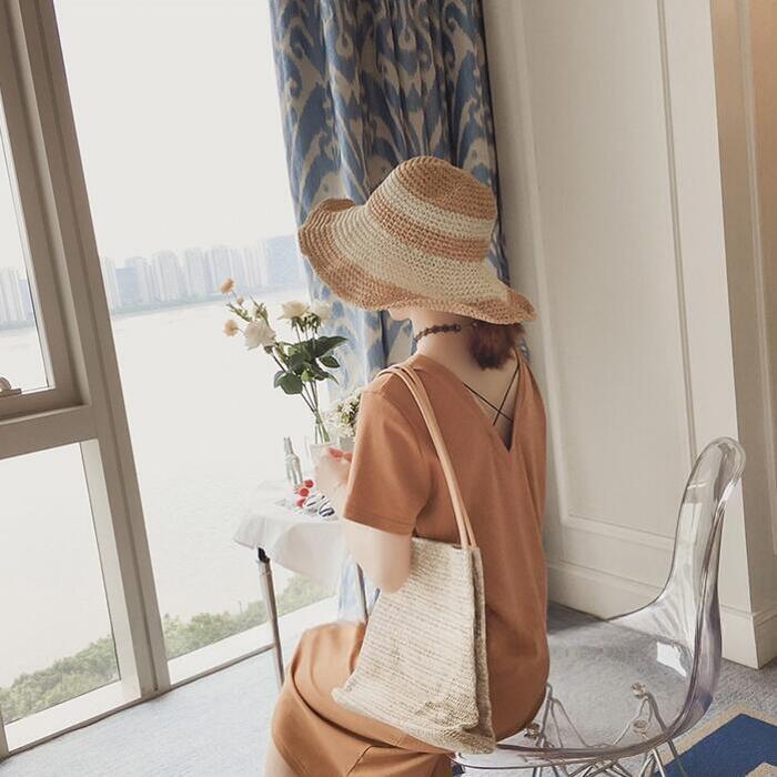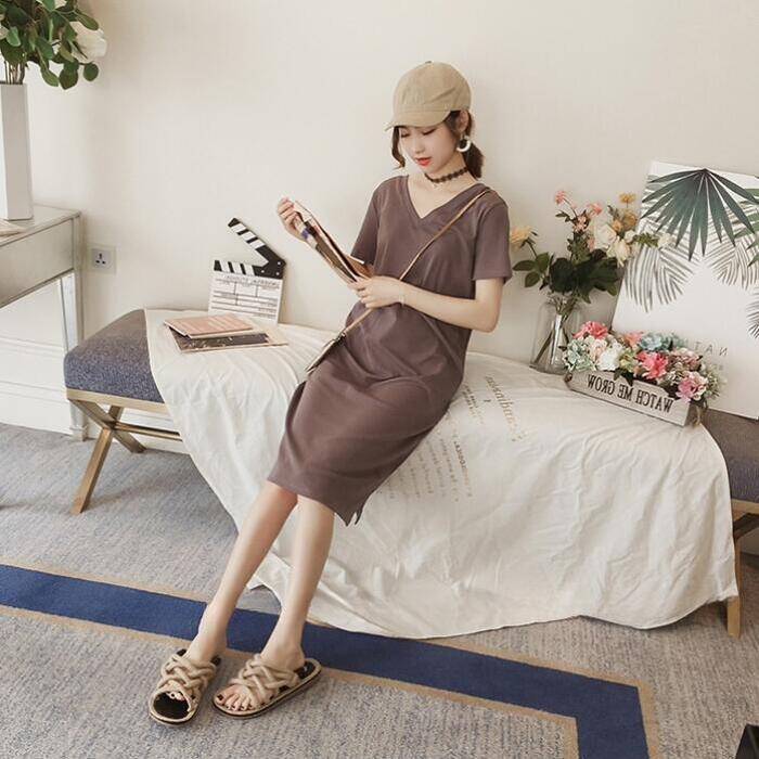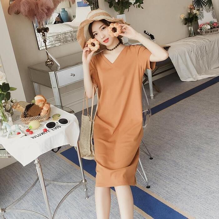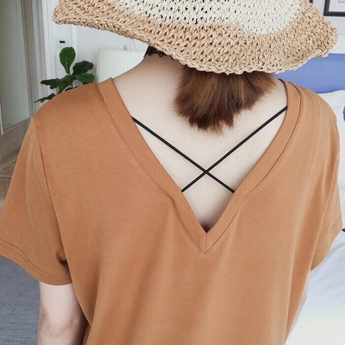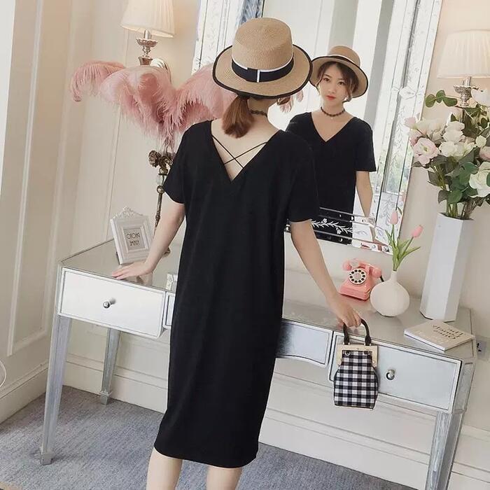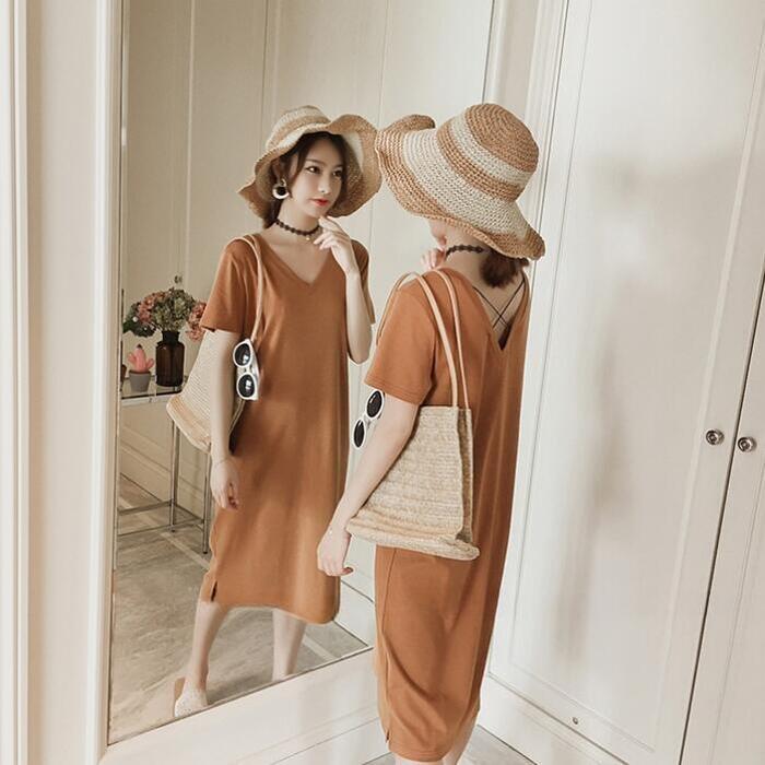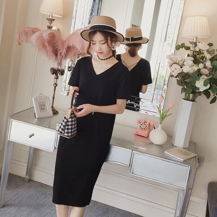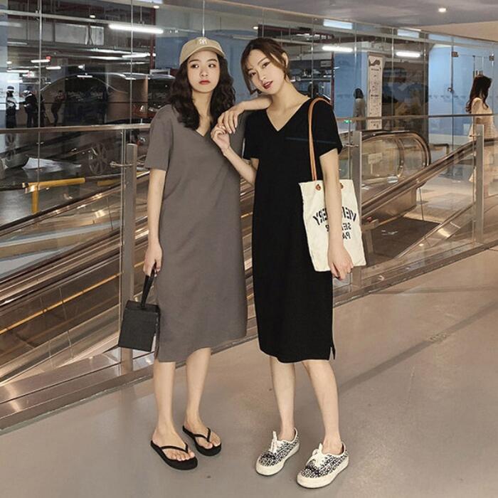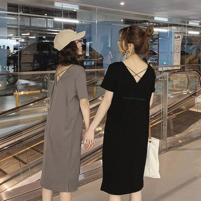 前後VネックのTシャツワンピース。