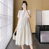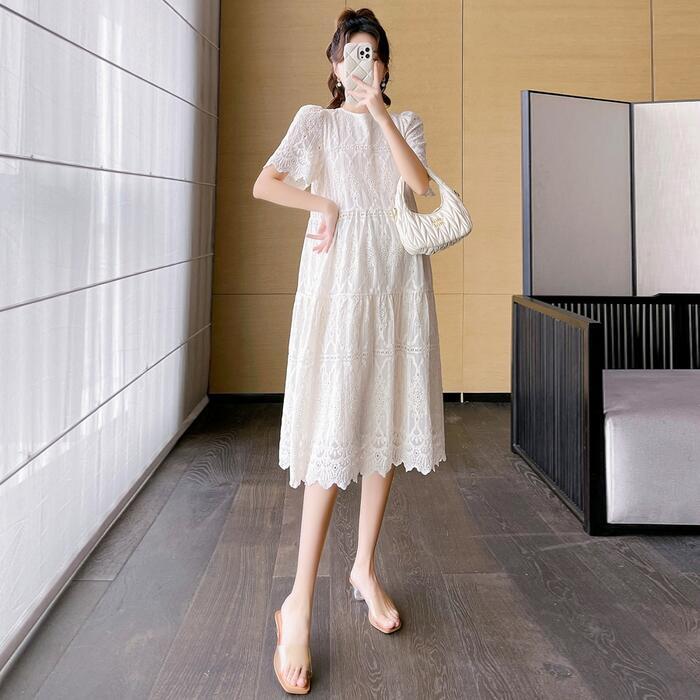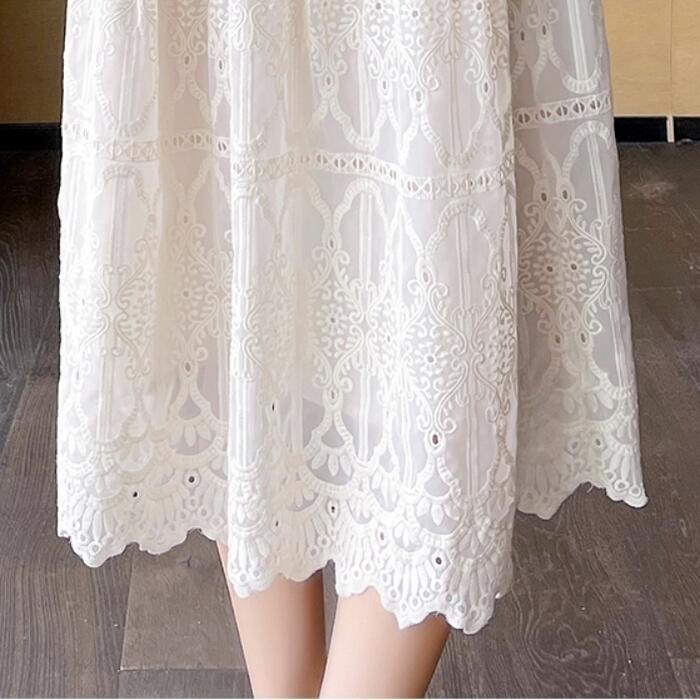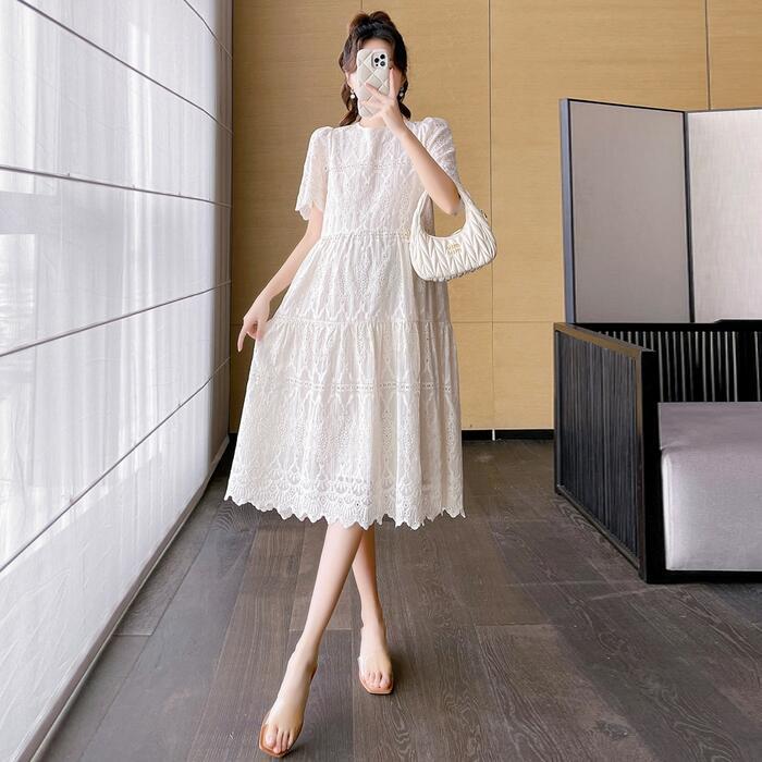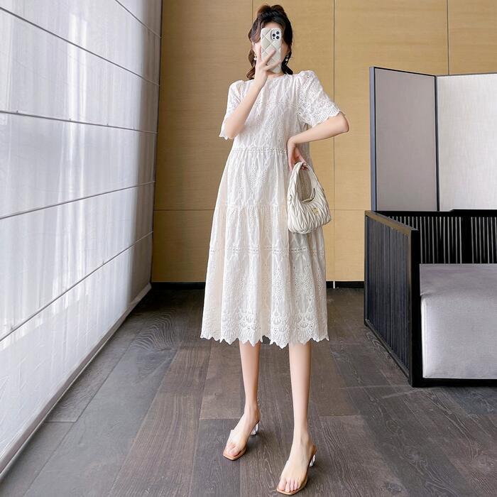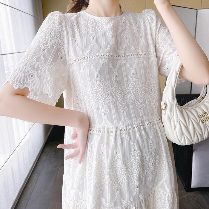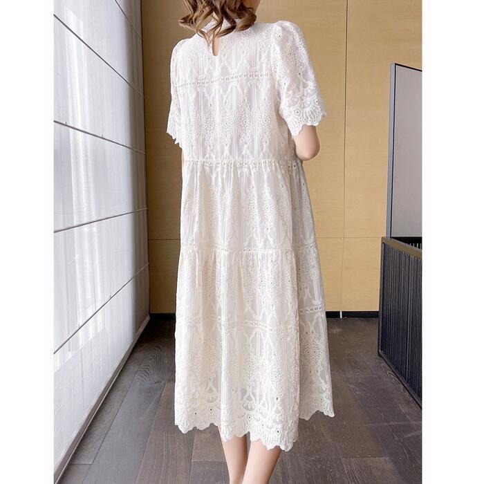 大きいサイズ ワンピース ワンピ ドレス 袖あり レース ティアード レディース エレガント きれいめ カジュアル シンプル 大人 可愛い フェミニン ミモレ丈 おしゃれ ゆったり 体型カバー ホワイト 白 春 秋 夏 20代 30代 40代 50代
