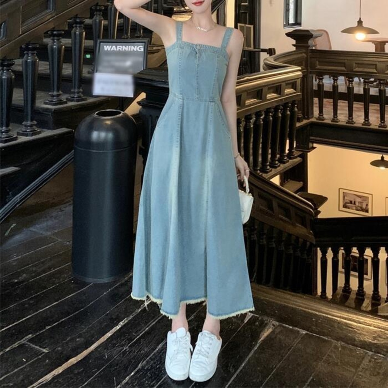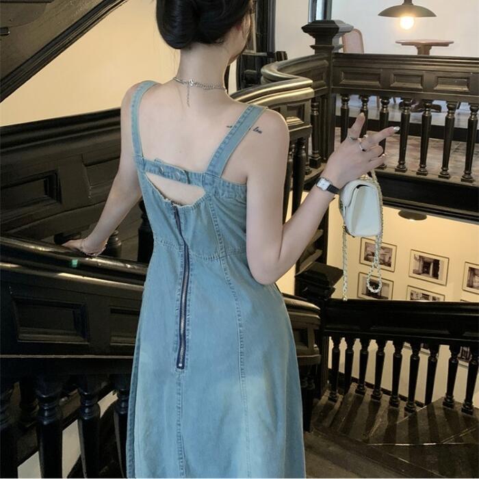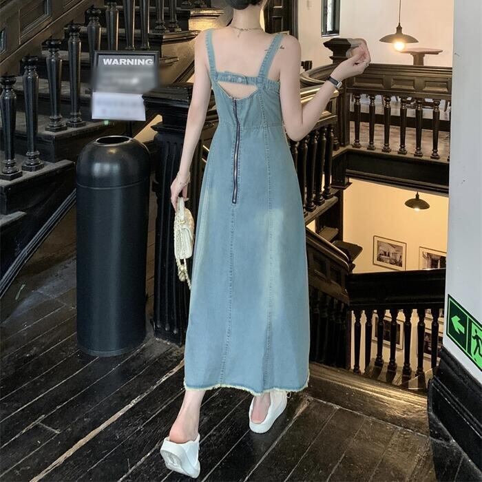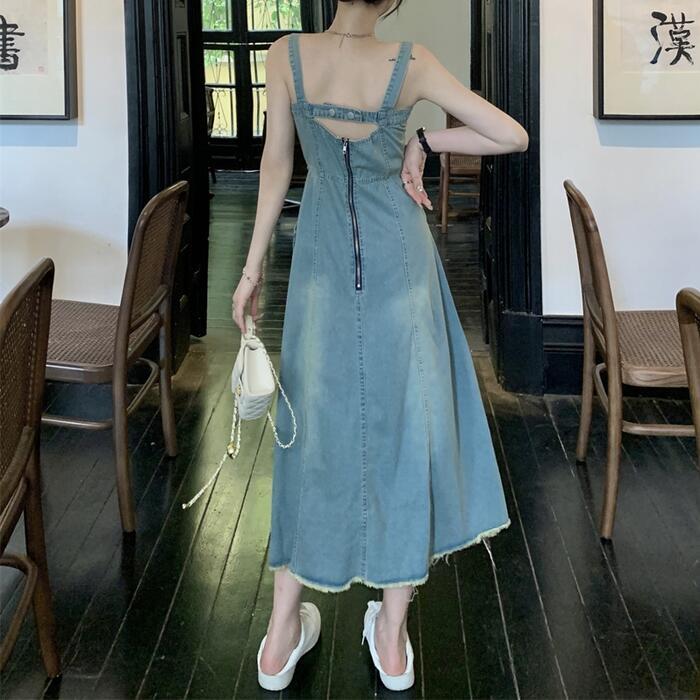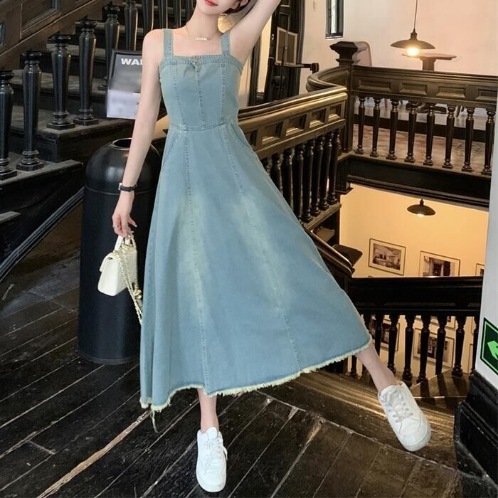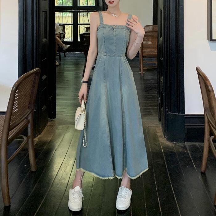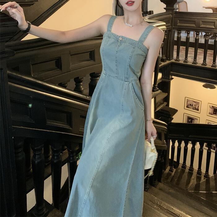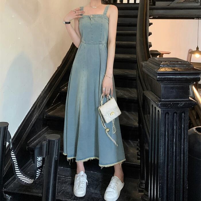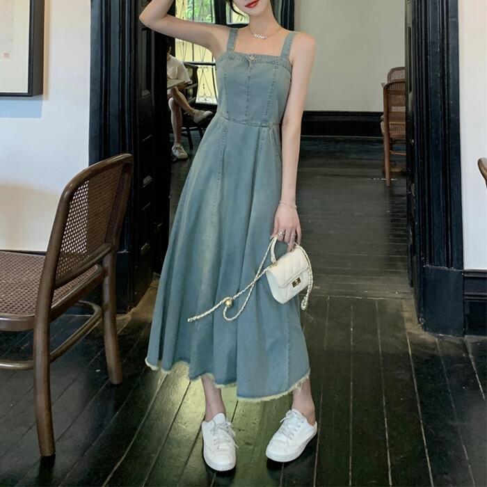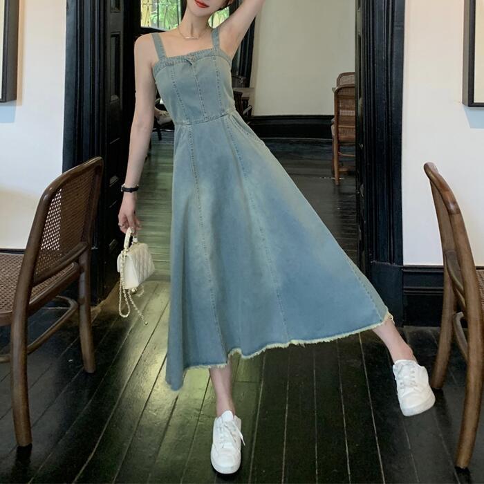 綺麗なAラインシルエットのデニムキャミワンピース。