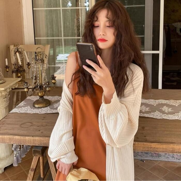 すとんとしたリブデザインで、さっと羽織って縦長コーデの完成。