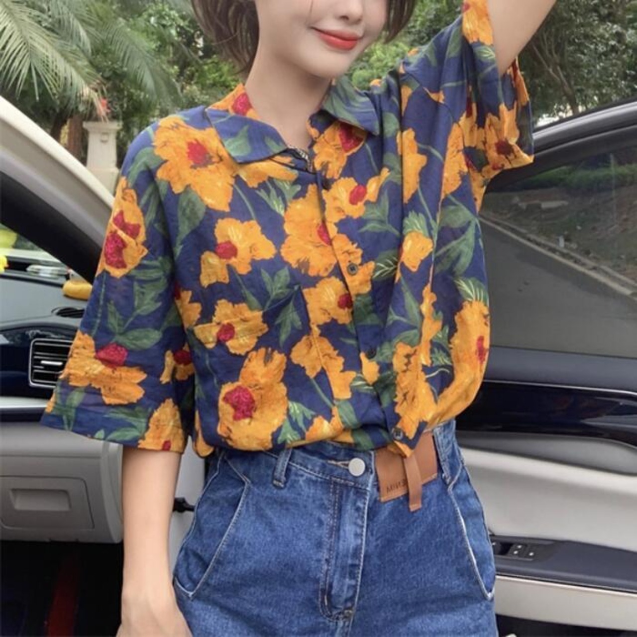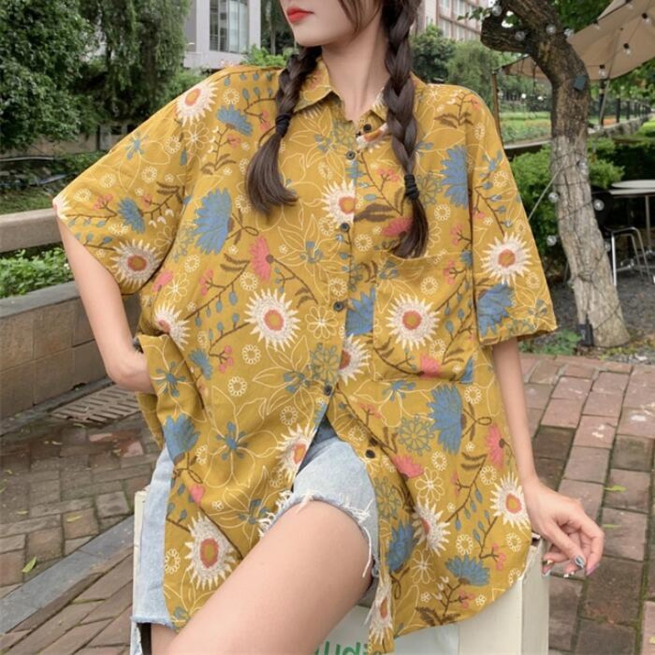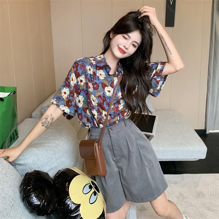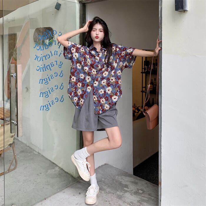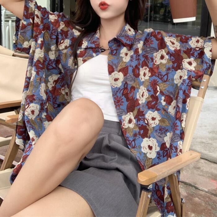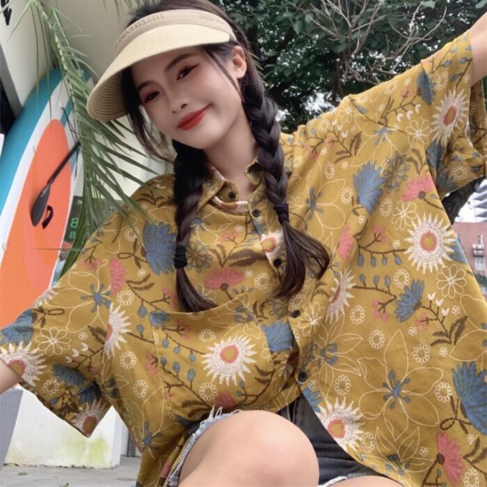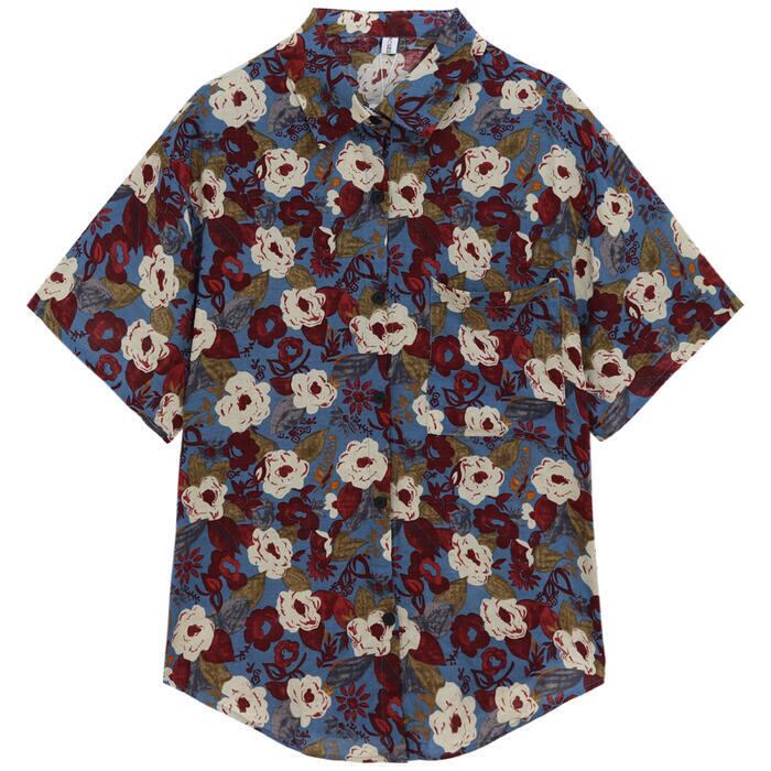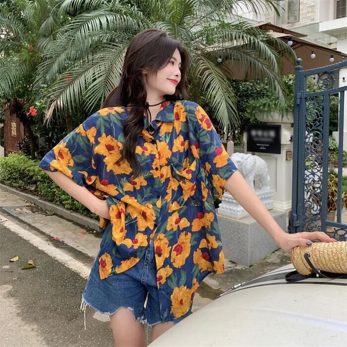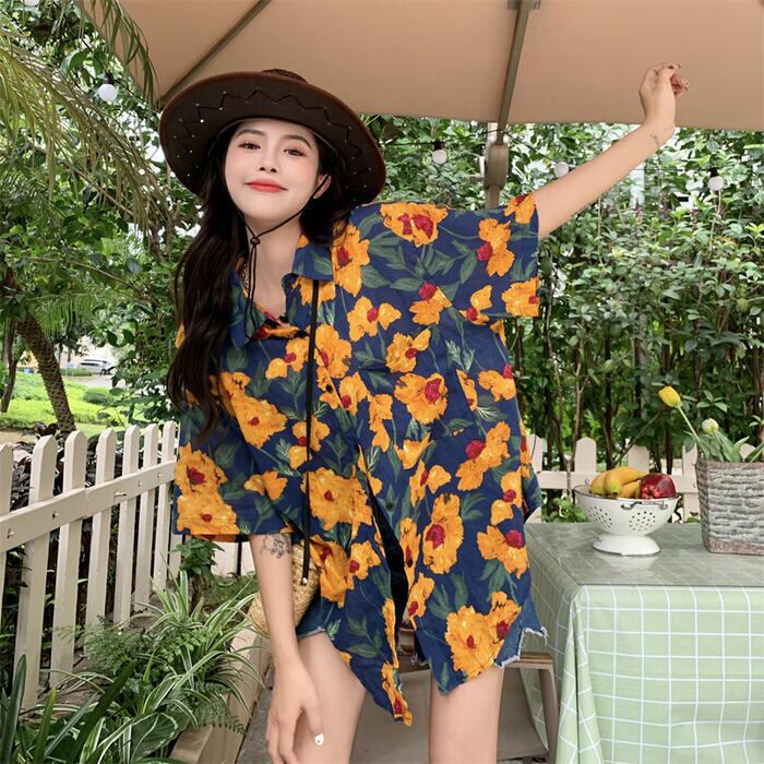 全3色 トップス ブラウス シャツ 花柄 フラワー プリント レディース 半袖 エレガント きれいめ カジュアル フェミニン 大人 可愛い ゆったり オーバーサイズ ビッグシルエット 羽織り 体型カバー 青 ブルー イエロー 春 秋 夏 20代 30代 40代 50代