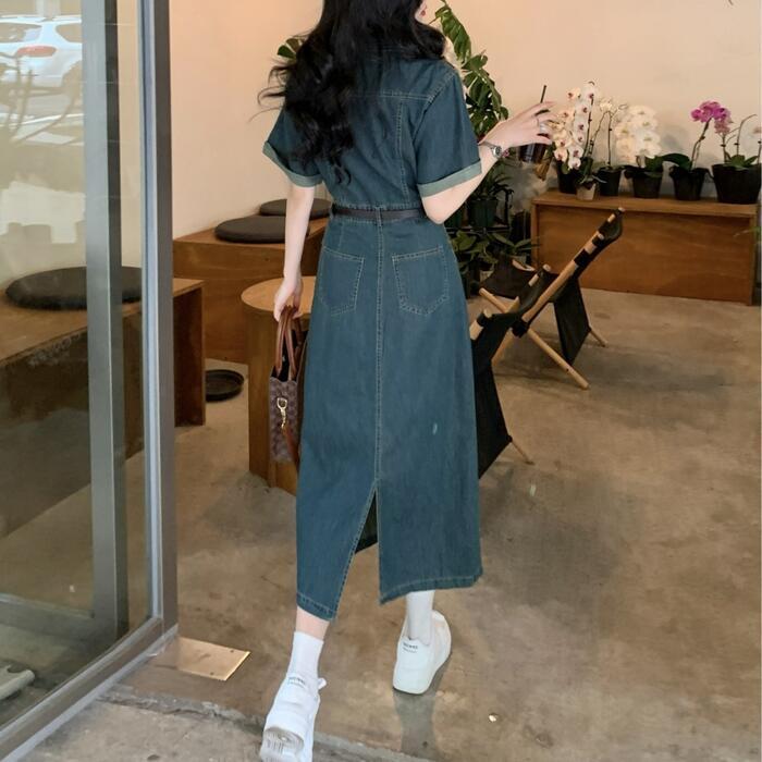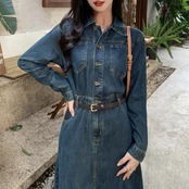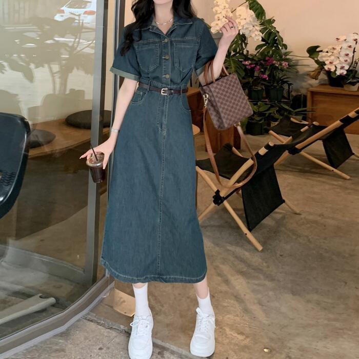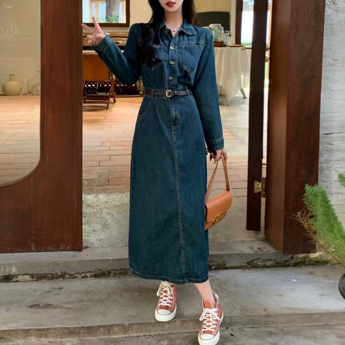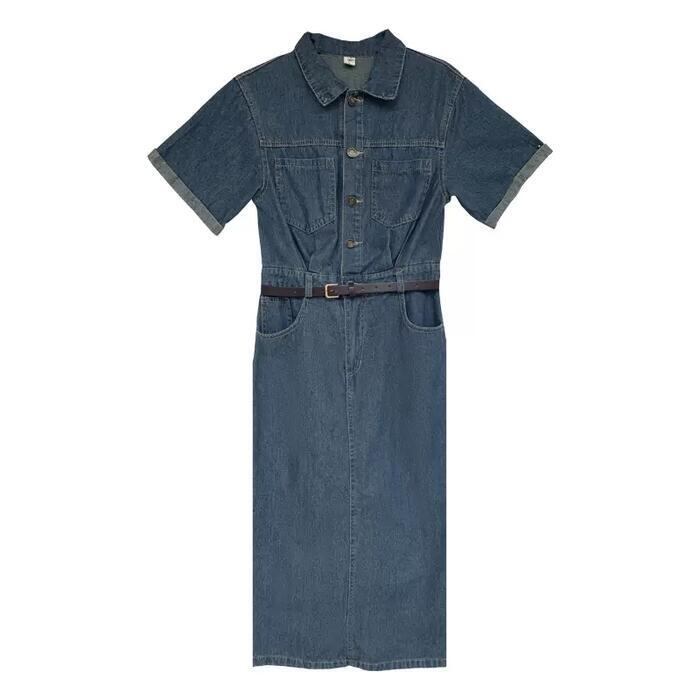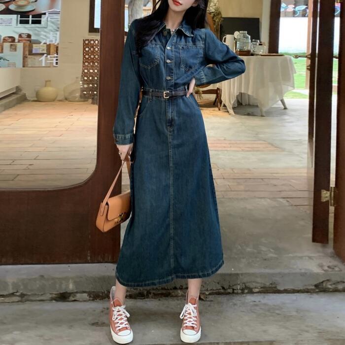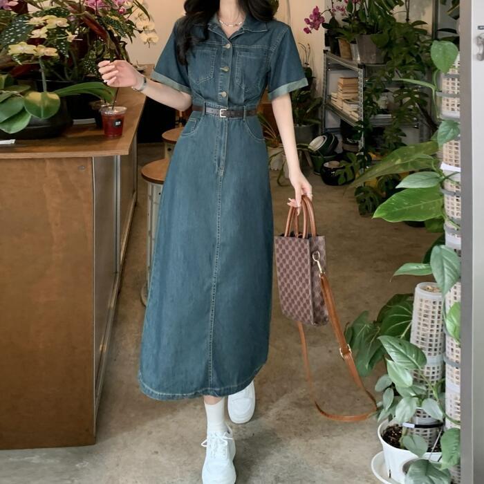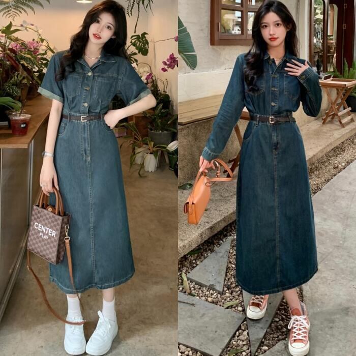 全2種 大きいサイズ ワンピース ワンピ ドレス デニム 袖あり レディース エレガント きれいめ カジュアル 長袖 半袖 大人 可愛い フェミニン ナチュラル ミモレ丈 Aライン ウエストベルト シンプル 体型カバー 青 ブルー 春 夏 秋 冬 20代 30代 40代 50代