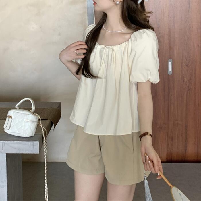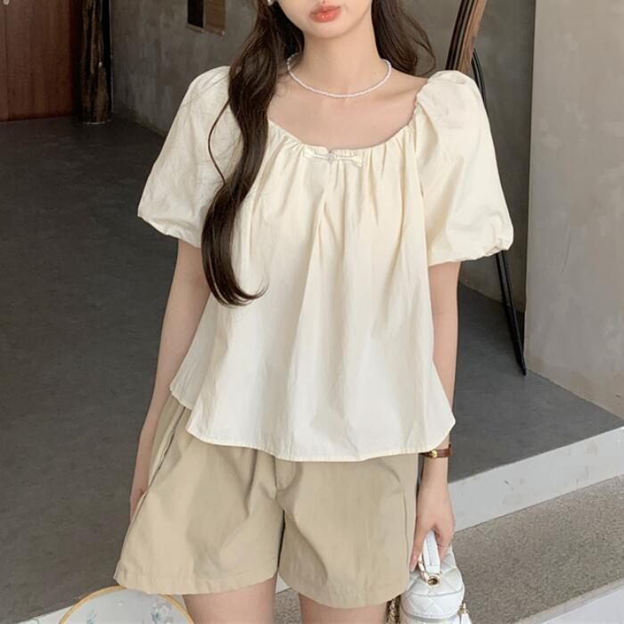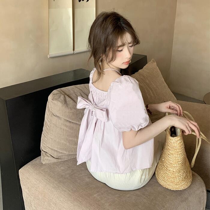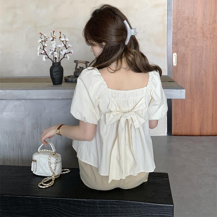 背中のギャザー×リボンが可愛い半袖トップス。