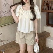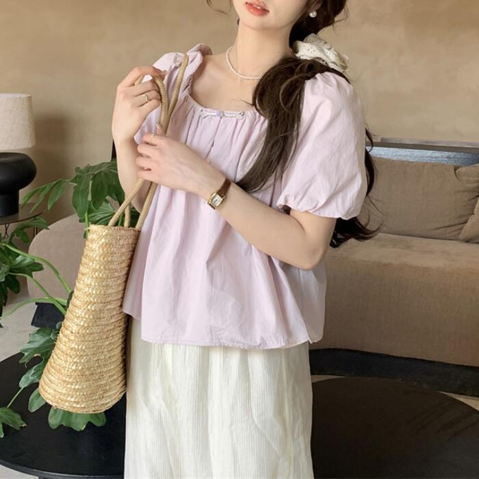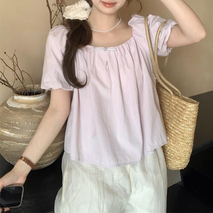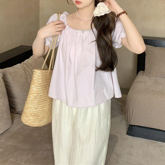 全2色 大きいサイズ パフスリーブ トップス ブラウス Tシャツ カットソー レディース エレガント きれいめ カジュアル フェミニン 大人 可愛い 半袖 ギャザー バックリボン スクエアネック 体型カバー ナチュラル パープル ベージュ 春 秋 夏 20代 30代 40代 50代