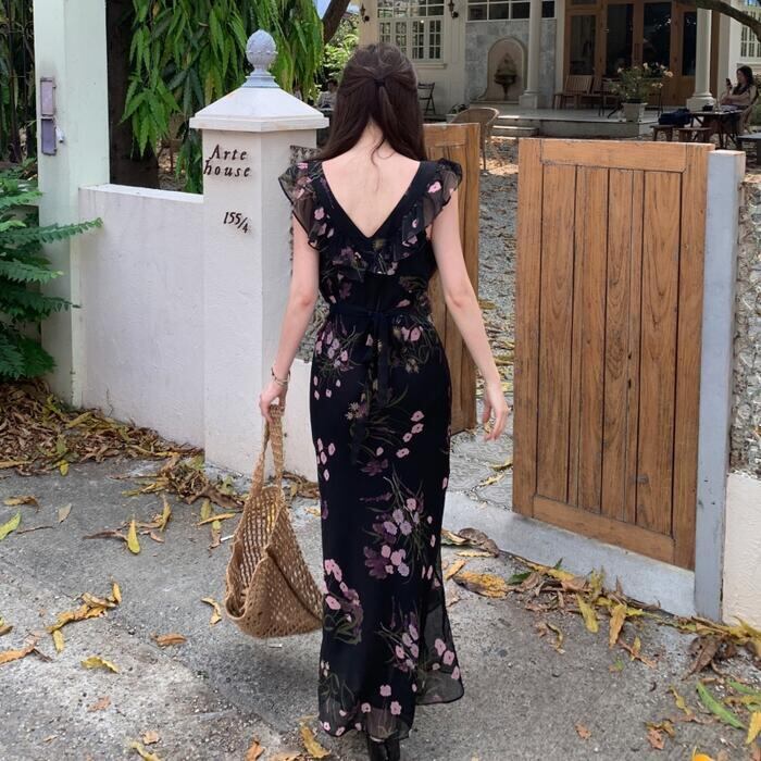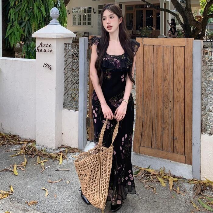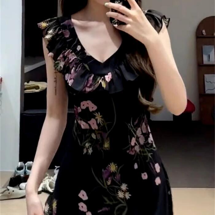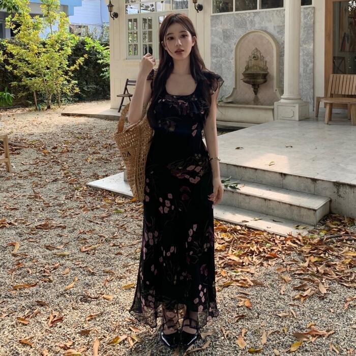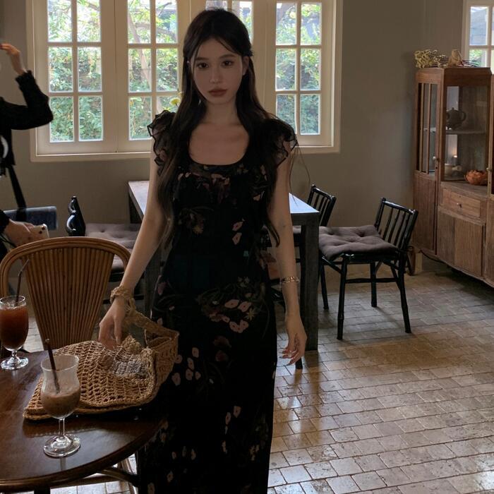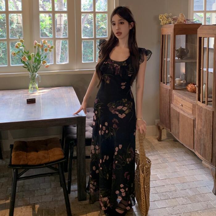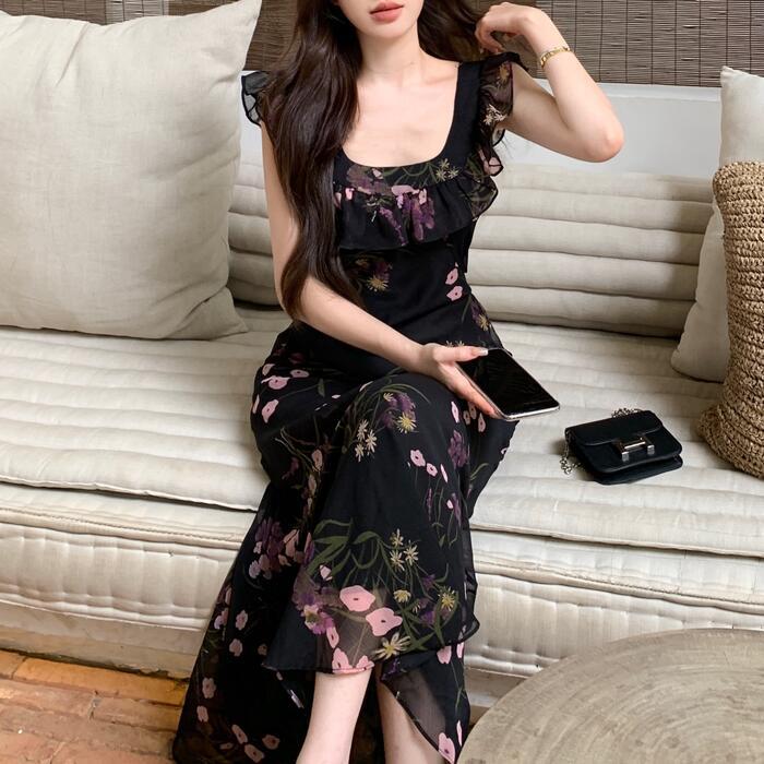 ワンピース ワンピ ドレス フラワー 花柄 レディース エレガント きれいめ カジュアル ノースリーブ 大人 可愛い フェミニン ナチュラル ロング丈 スクエアネック ハイウエスト スリム スレンダー ブラック 黒 春 夏 秋 20代 30代 40代 50代