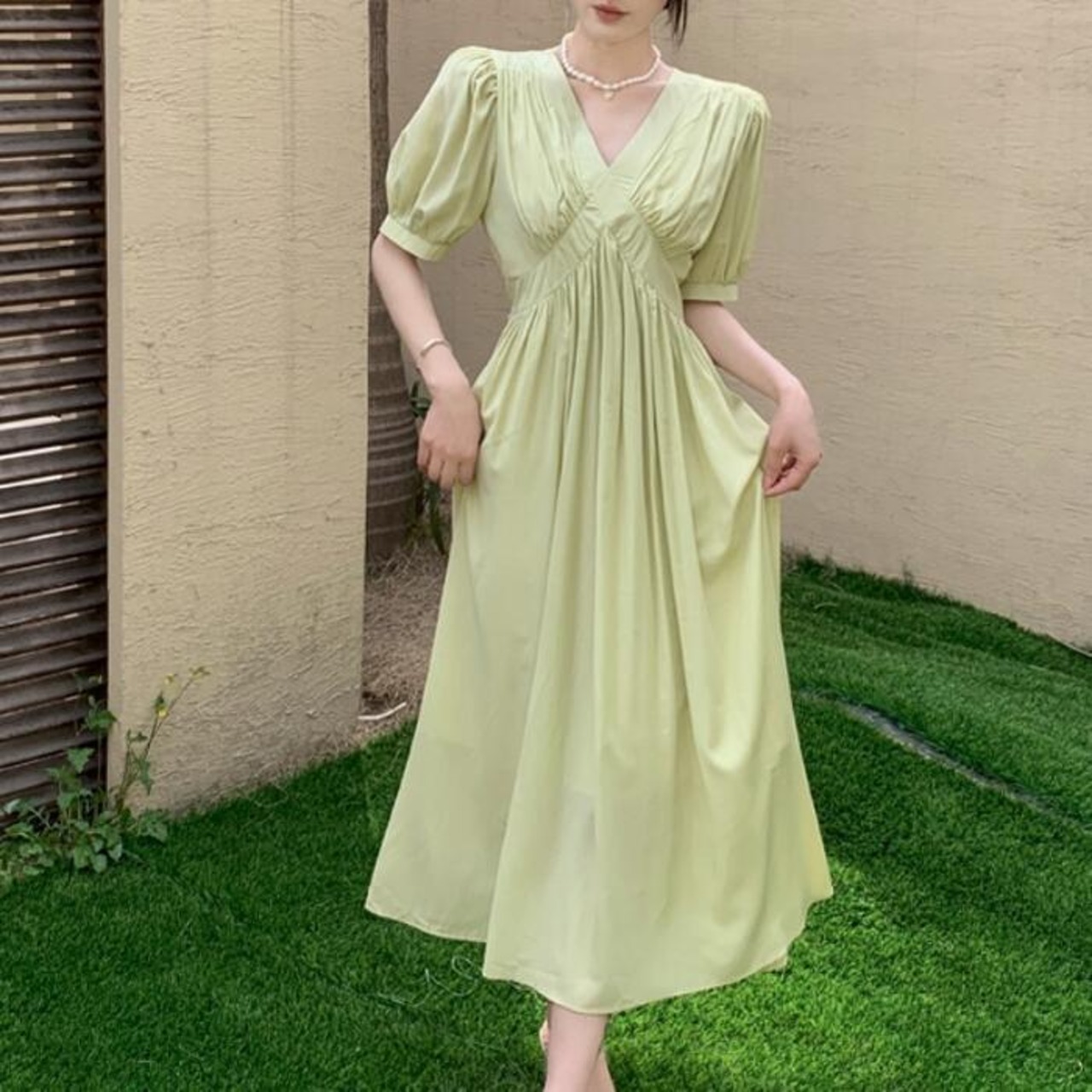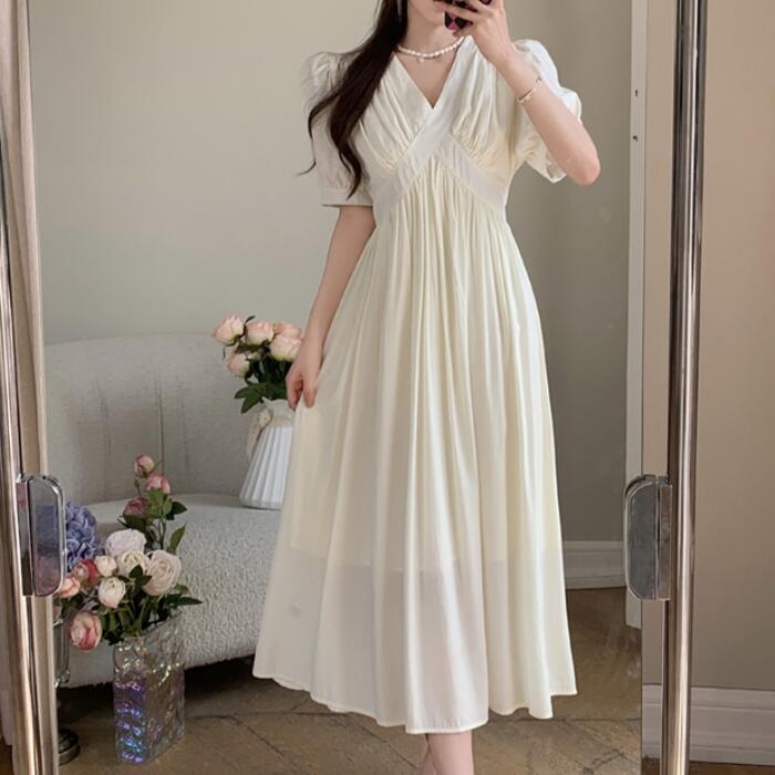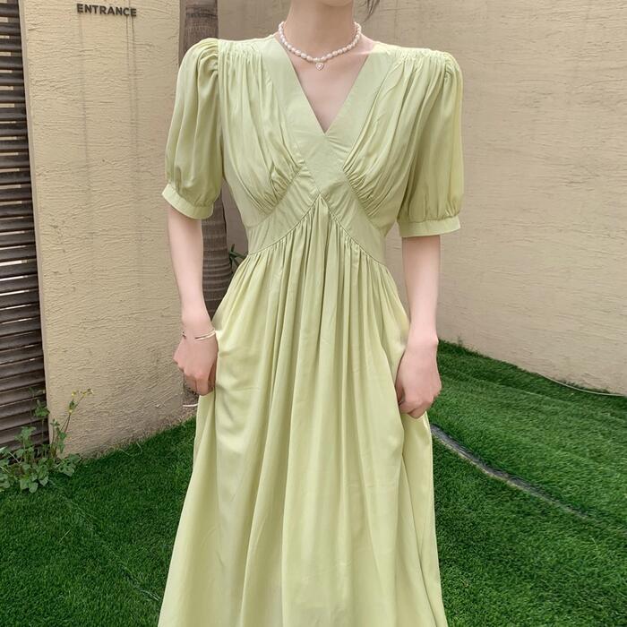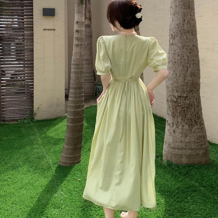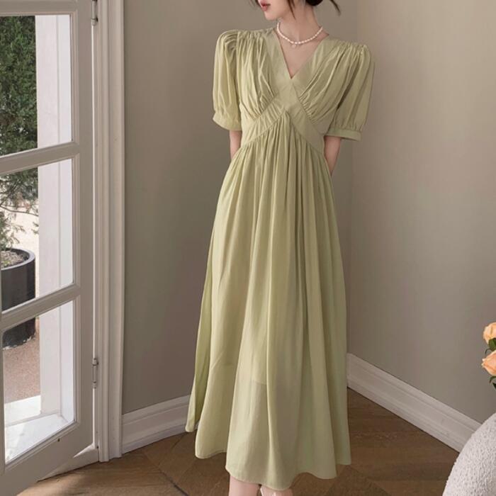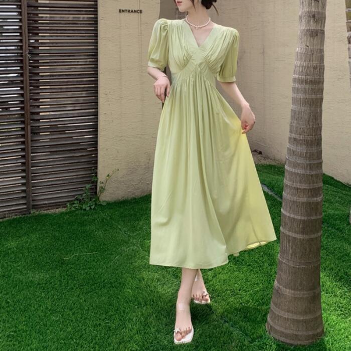 全2色 大きいサイズ 体型カバー パフスリーブ ワンピース ワンピ ドレス 袖あり 切り替え レディース エレガント きれいめ カジュアル 半袖 大人 可愛い フェミニン ナチュラル ロング丈 Vネック ハイウエスト Aライン グリーン 緑 ベージュ 春 夏 秋 20代 30代 40代 50代
