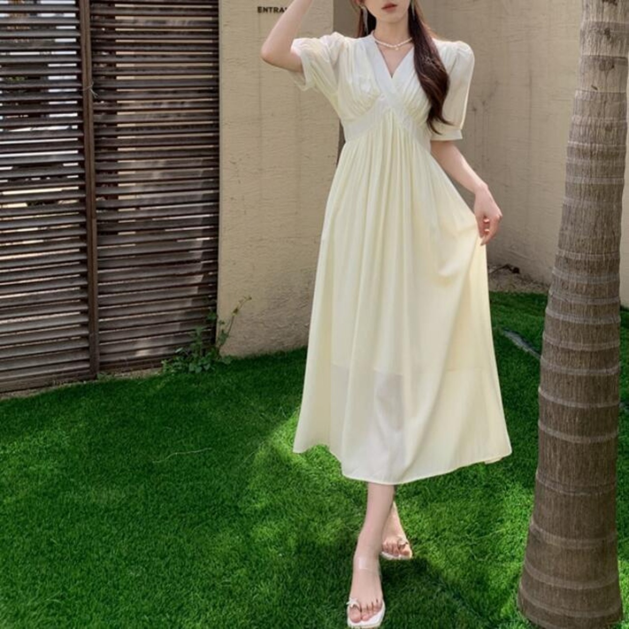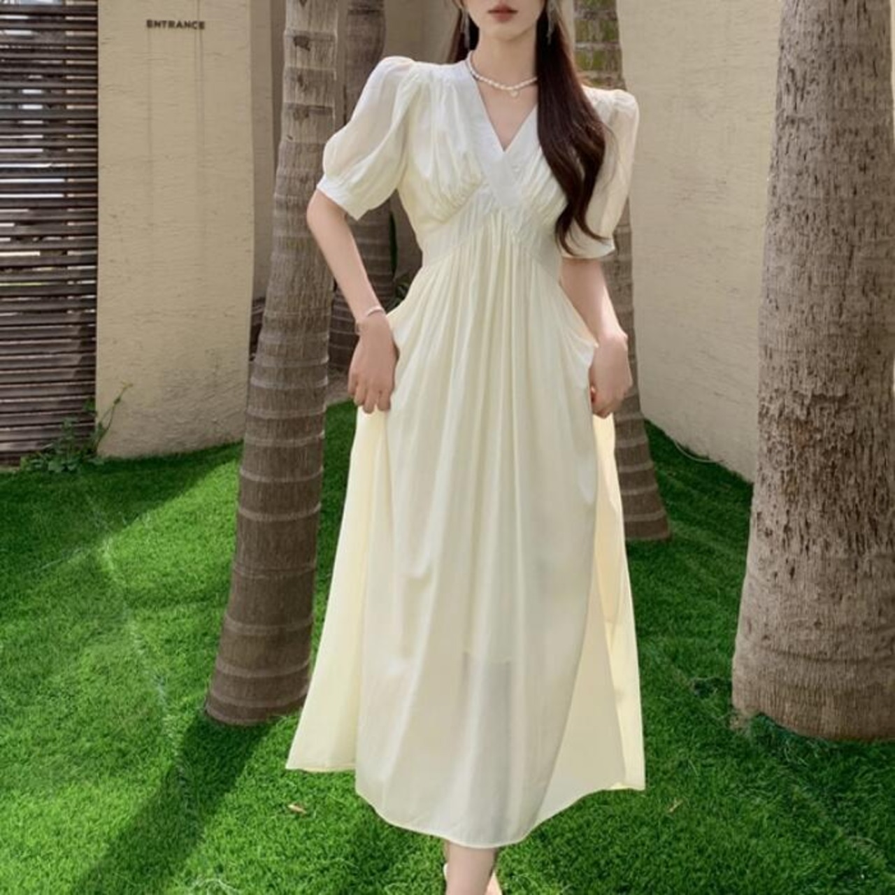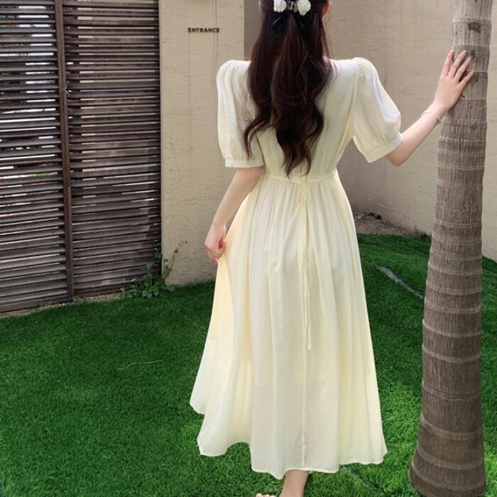 全2色 大きいサイズ 体型カバー パフスリーブ ワンピース ワンピ ドレス 袖あり 切り替え レディース エレガント きれいめ カジュアル 半袖 大人 可愛い フェミニン ナチュラル ロング丈 Vネック ハイウエスト Aライン グリーン 緑 ベージュ 春 夏 秋 20代 30代 40代 50代