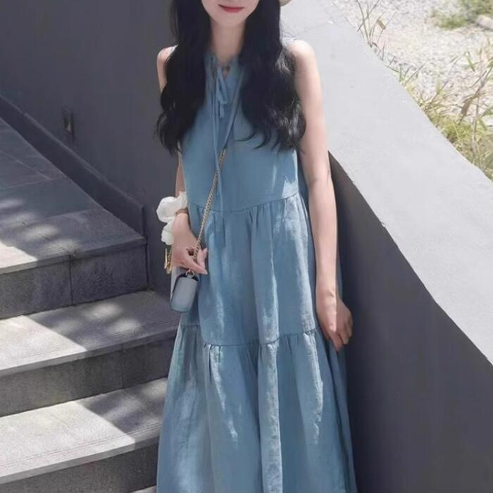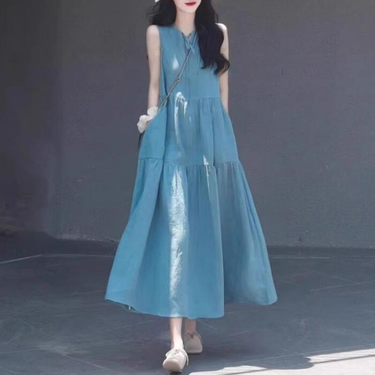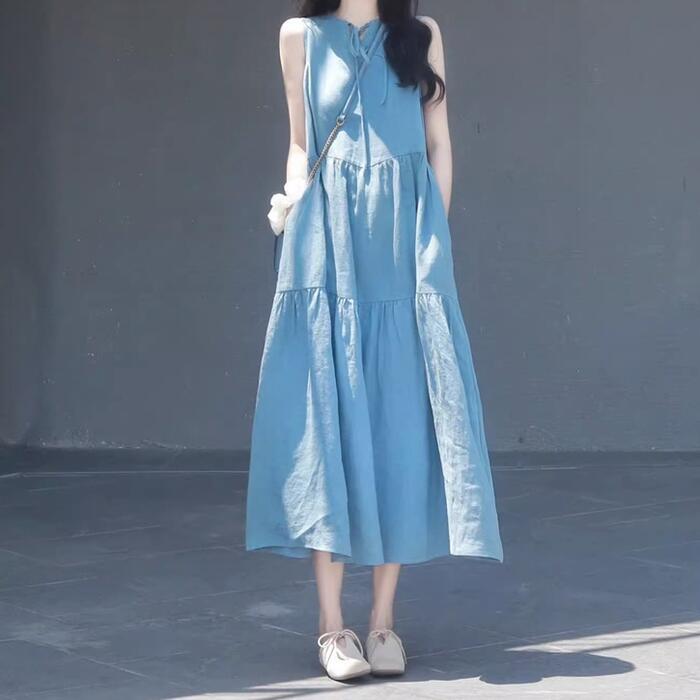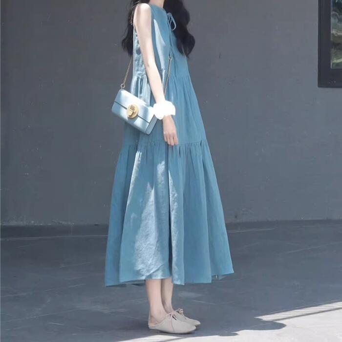 大きいサイズ 体型カバー ワンピース ワンピ ドレス ティアード リボン レディース エレガント きれいめ カジュアル ノースリーブ 大人 可愛い ロング丈 フェミニン シンプル ナチュラル Aライン ゆったり 楽ちん 青 ブルー 春 夏 秋 20代 30代 40代 50代