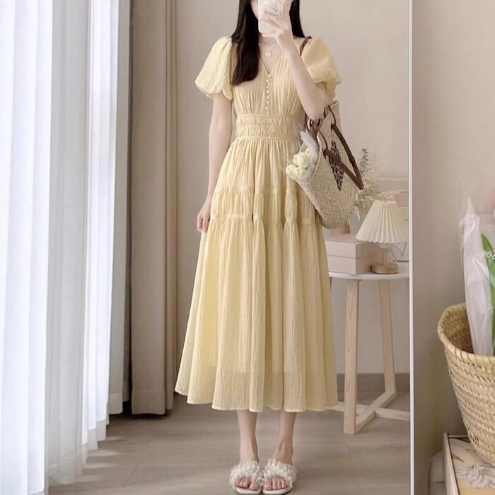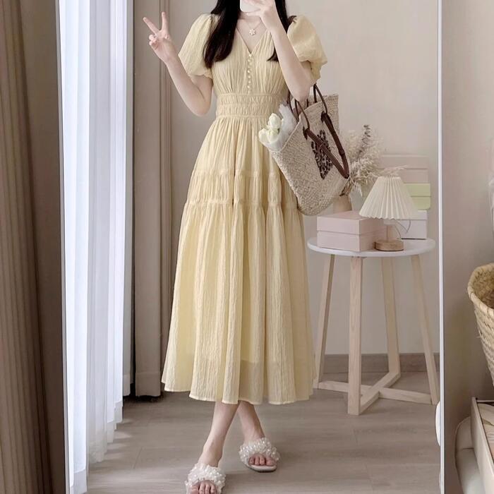 ワンピース ワンピ ドレス 袖あり パフスリーブ レディース エレガント きれいめ カジュアル 半袖 ハイウエスト 大人 可愛い フェミニン ナチュラル Aライン ミモレ丈 Vネック ウエストゴム 体型カバー イエロー 春 秋 夏 20代 30代 40代 50代