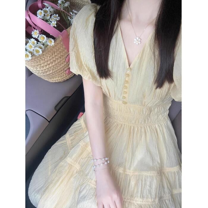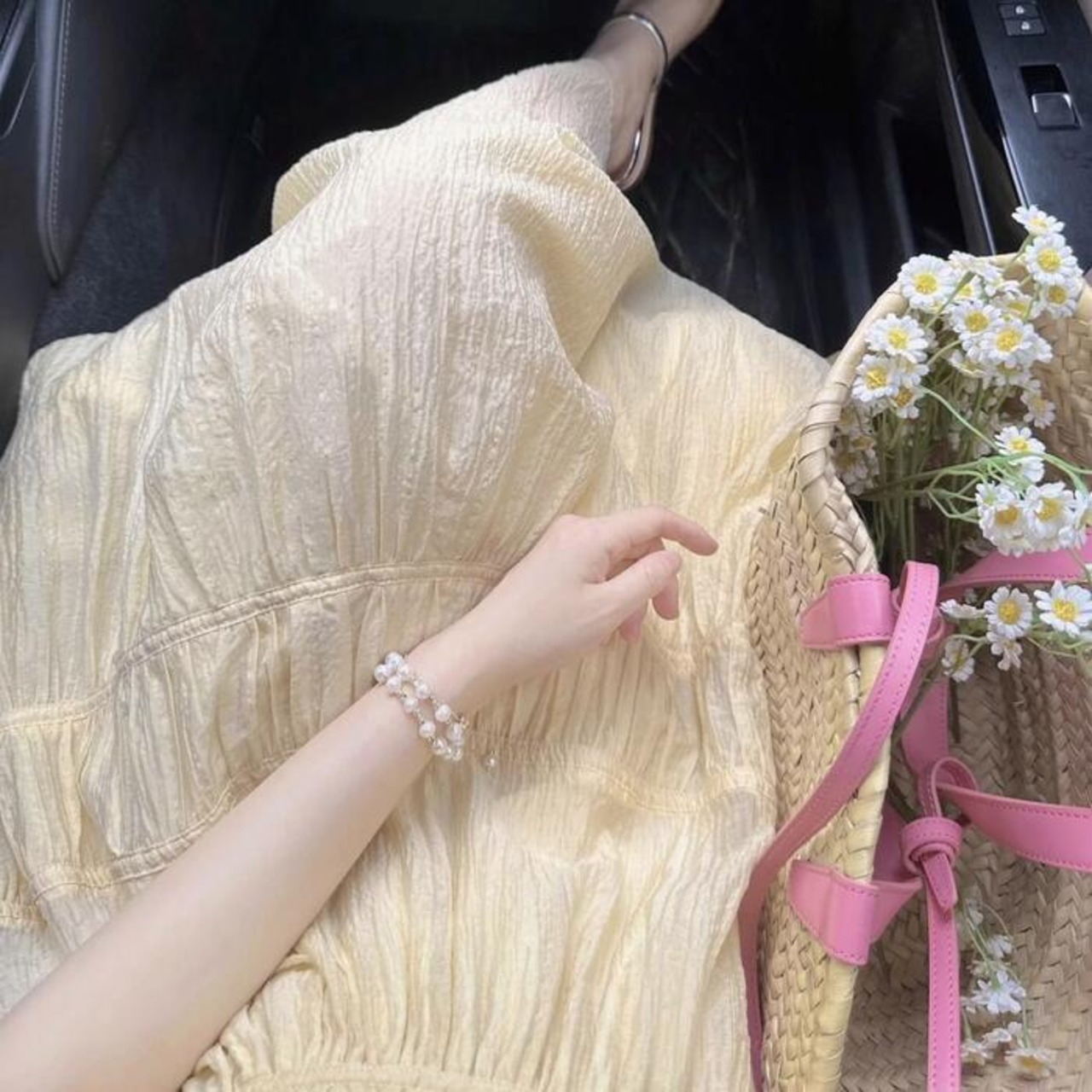 爽やかなイエローカラーが目を惹くパフスリーブワンピース。