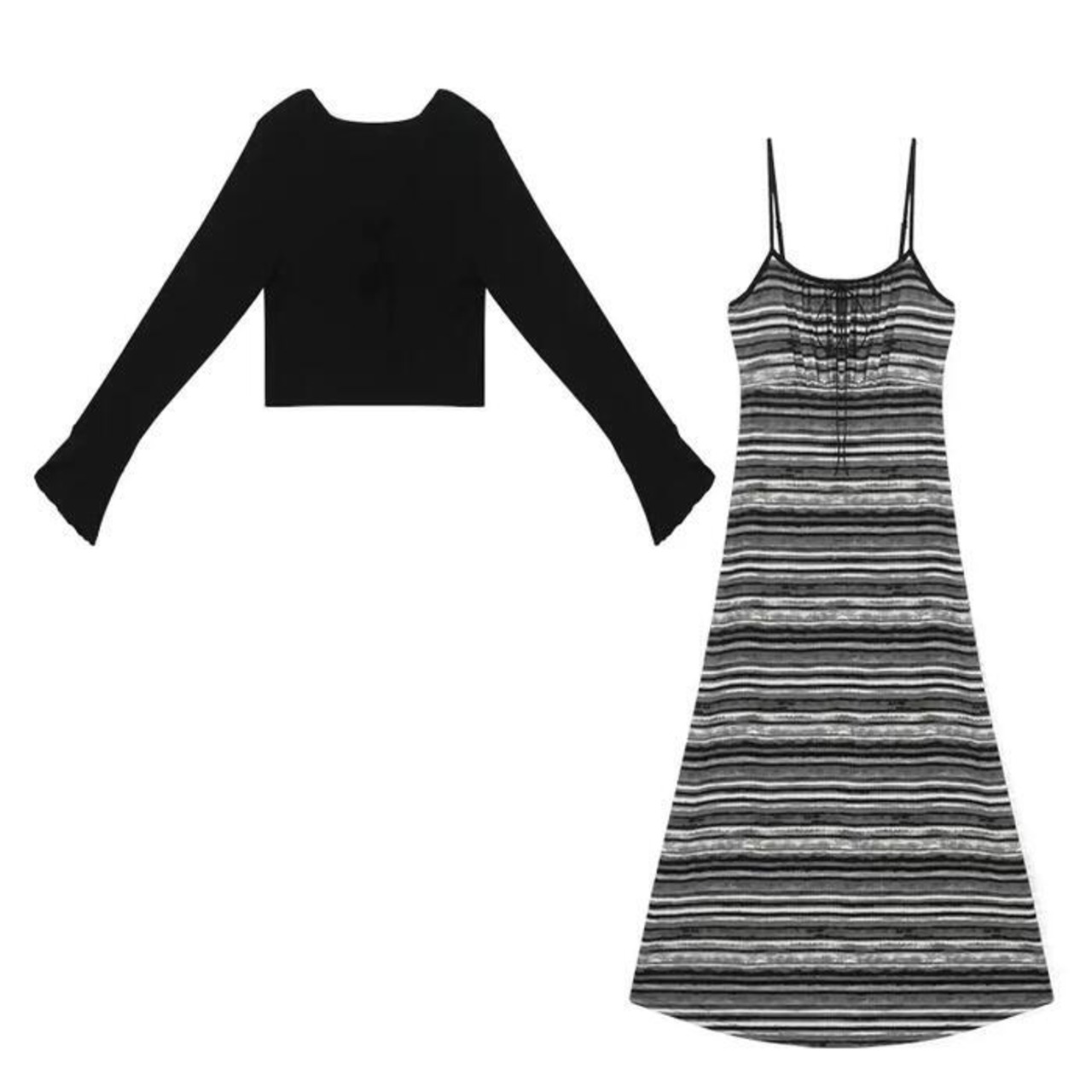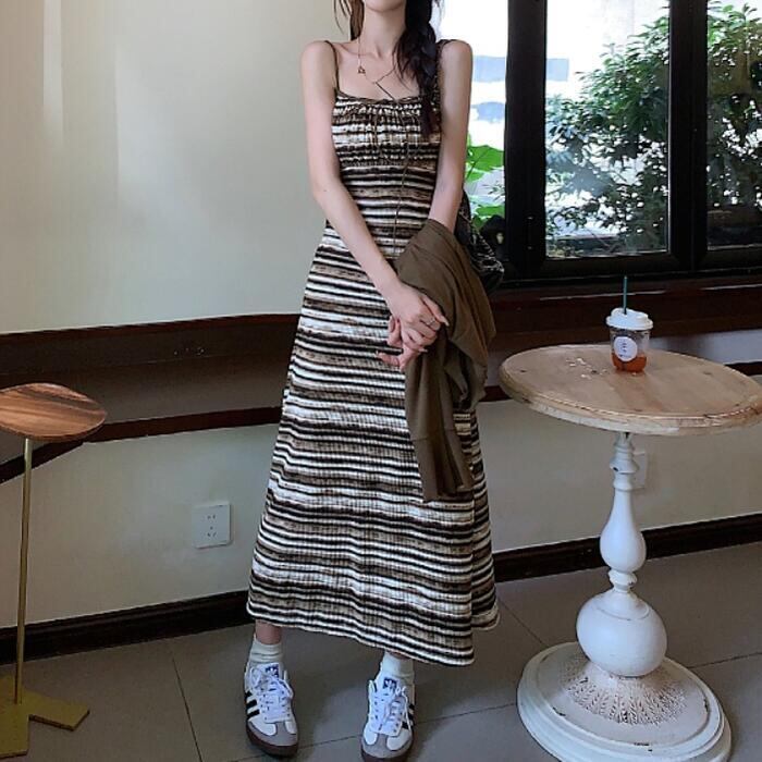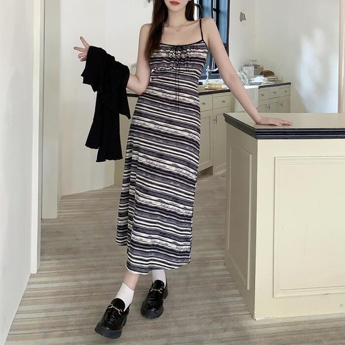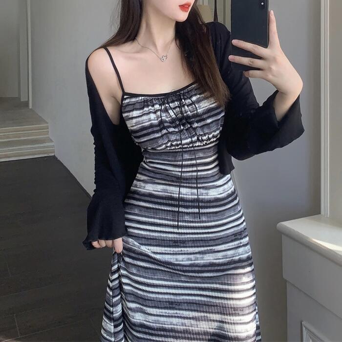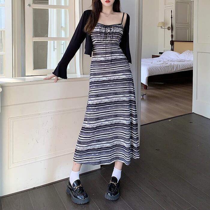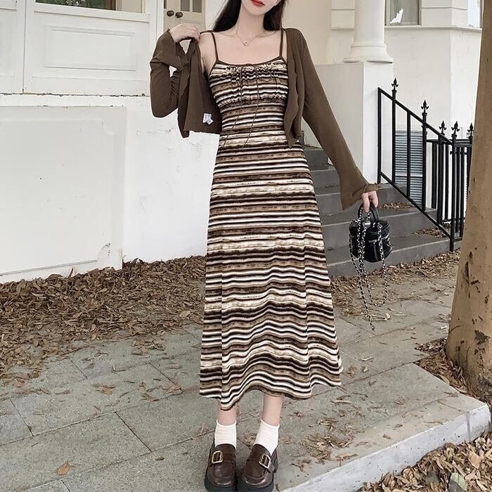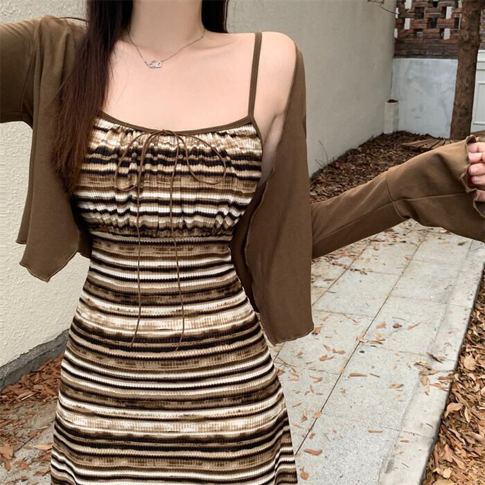 マルチボーダー柄のキャミソールワンピースとカーディガンのセット。