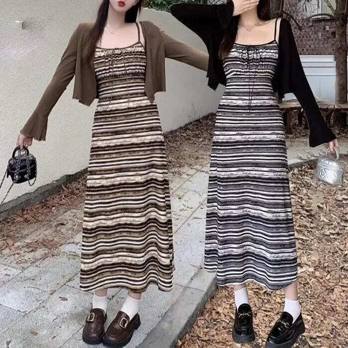 全2色 大きいサイズ レイヤード セットアップ 2点セット ワンピース カーディガン ボーダー レディース キャミワンピ エレガント きれいめ カジュアル 大人 可愛い Aライン ショート丈 体型カバー ミモレ丈 ベージュ ブラック 黒 春 秋 夏 20代 30代 40代 50代