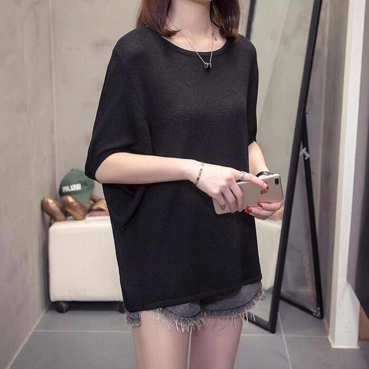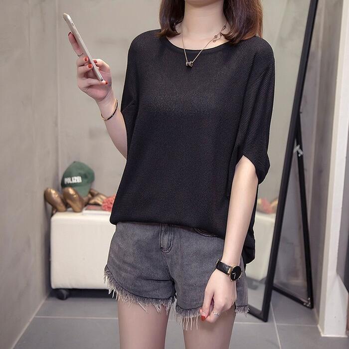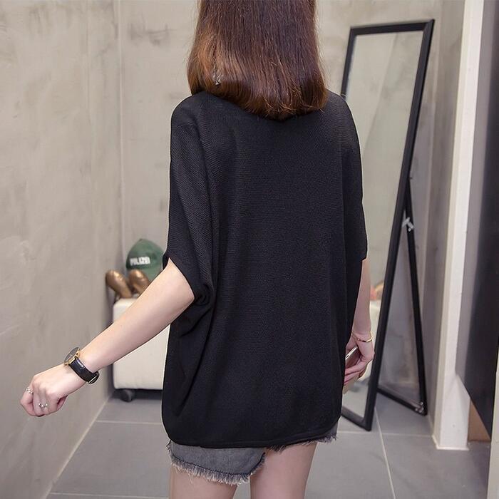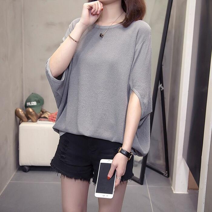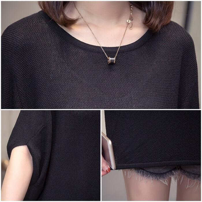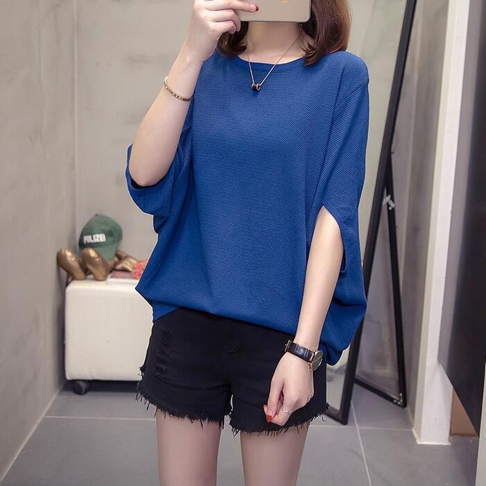 全3色 大きいサイズ シンプル トップス ニット カットソー ドルマンスリーブ Tシャツ レディース エレガント きれいめ カジュアル フェミニン 大人 可愛い 五分袖 体型カバー ナチュラル ゆったり グレー ブルー 青 ブラック 黒 春 秋 夏 20代 30代 40代 50代