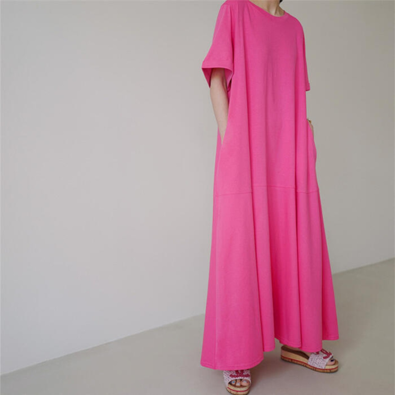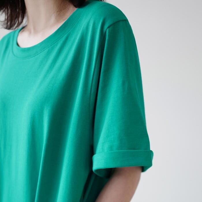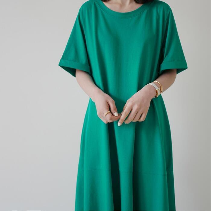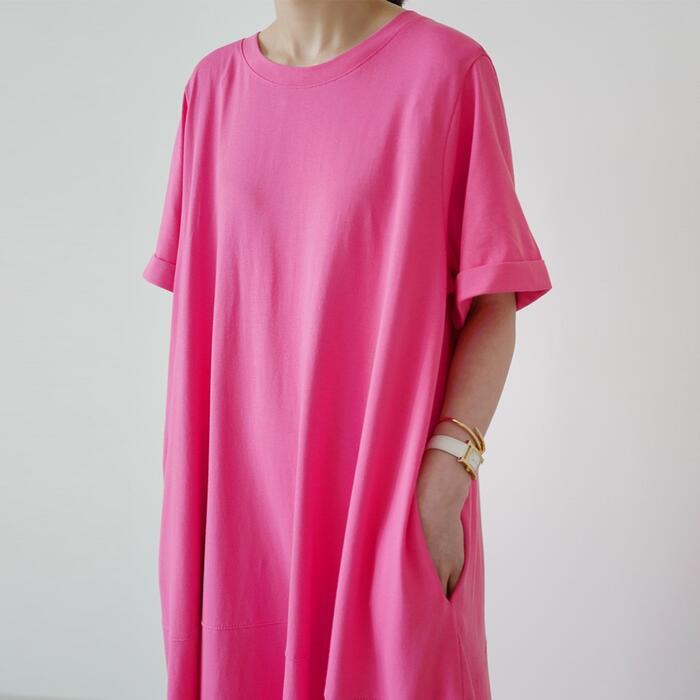 鮮やかなカラーが目を惹くロングTシャツワンピース。
