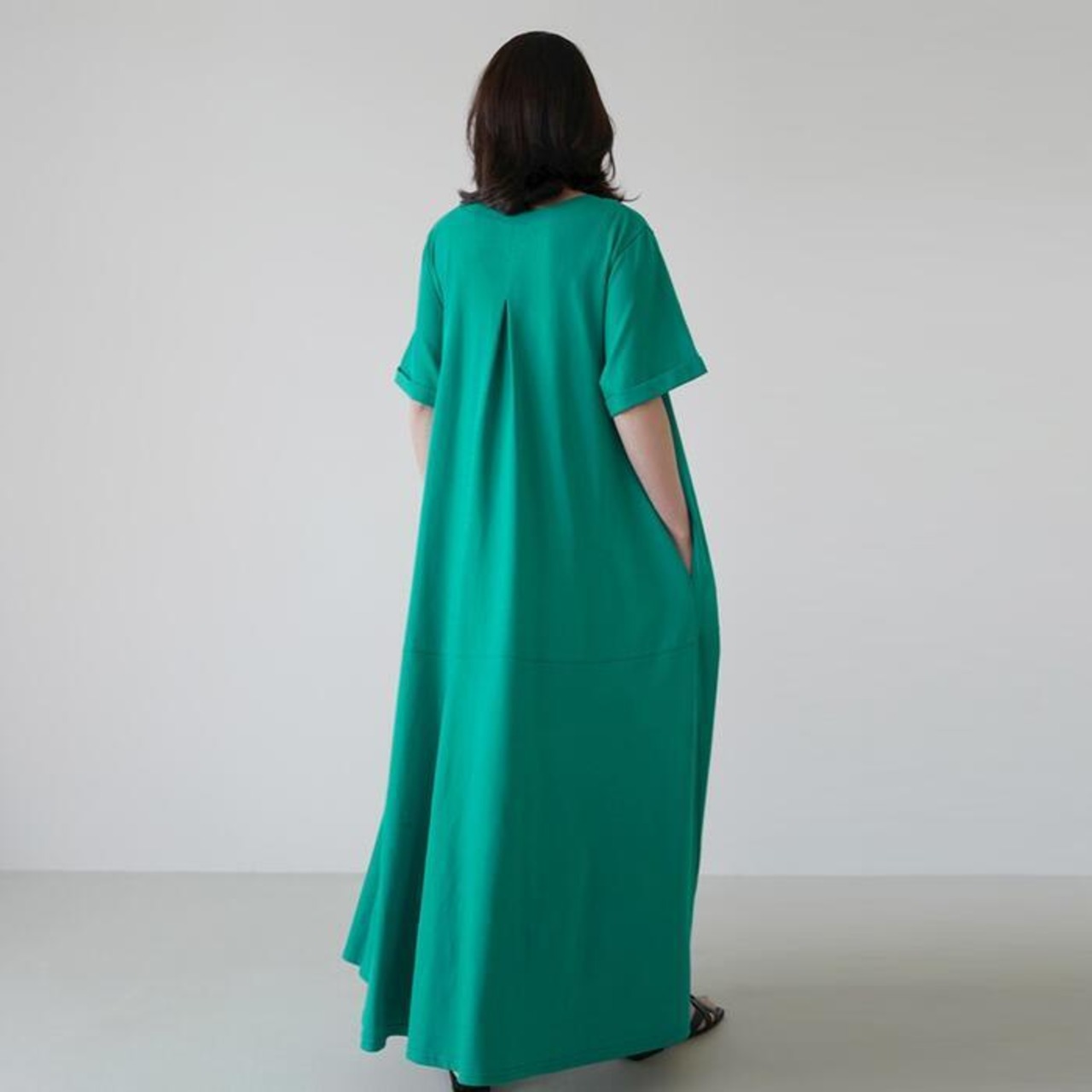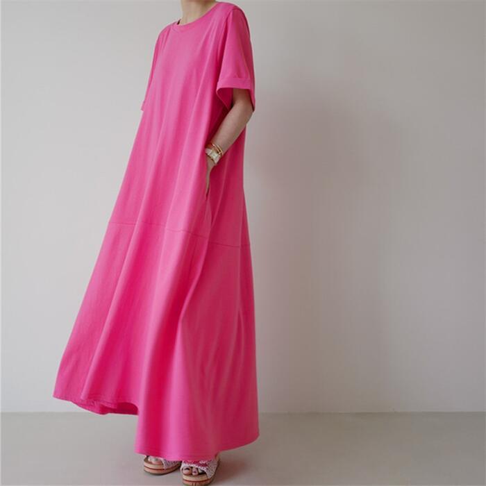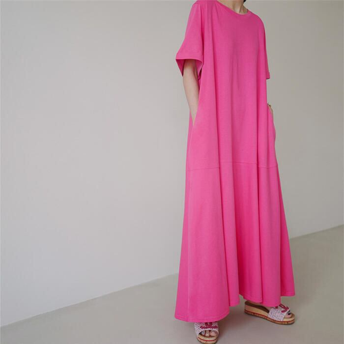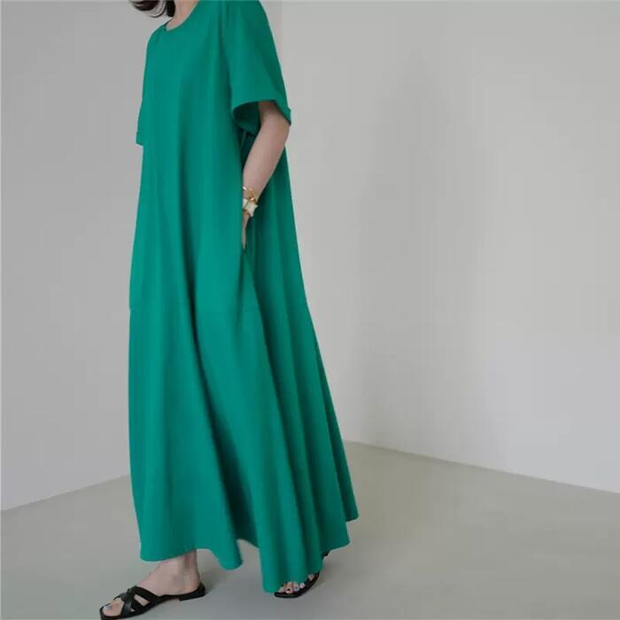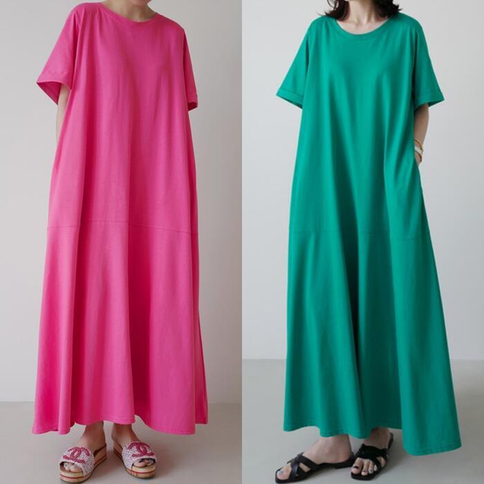 全2色 大きいサイズ 体型カバー ワンピース ワンピ ドレス Tシャツワンピ 袖あり レディース エレガント きれいめ カジュアル 半袖 大人 可愛い フェミニン Aライン ロング丈 フレア シンプル ゆったり リラックス グリーン 緑 ピンク 春 秋 夏 20代 30代 40代 50代