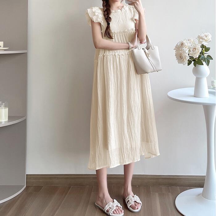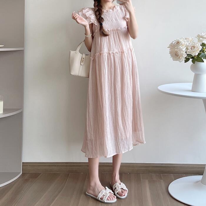 全2色 大きいサイズ 体型カバー ワンピース ワンピ ドレス 袖あり リンクル 楊柳 シワ加工 レディース エレガント きれいめ カジュアル 半袖 フリル 大人 可愛い フェミニン Aライン ミモレ丈 フレア シンプル リボン ゆったり リラックス ベージュ ピンク 春 秋 夏 20代 30代 40代 50代