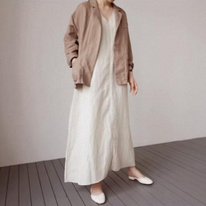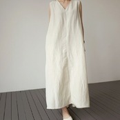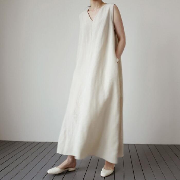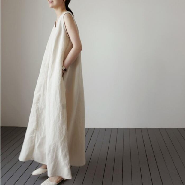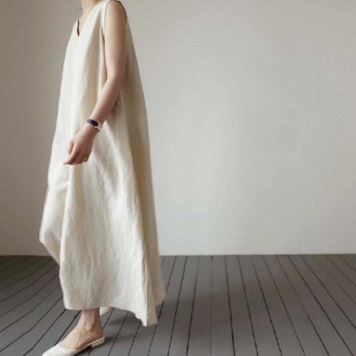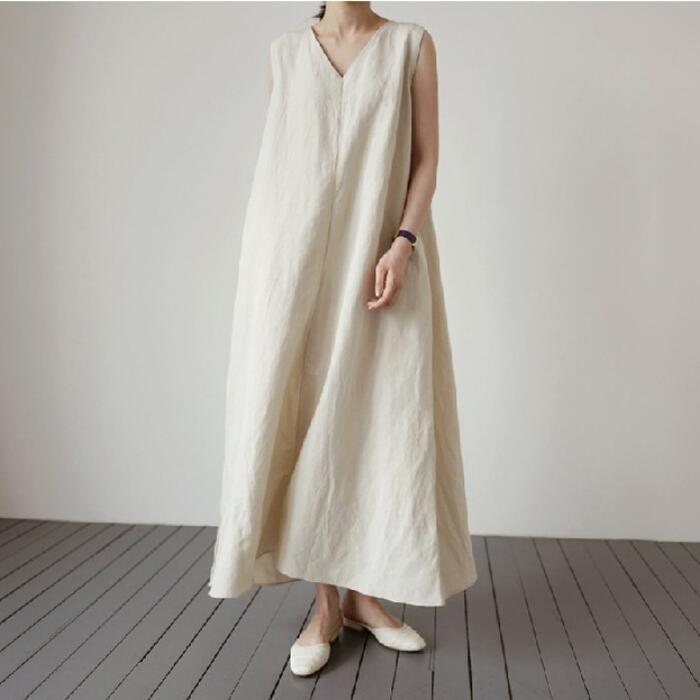 ワンピース ワンピ ドレス リネン混 レディース エレガント きれいめ カジュアル ノースリーブ 大人 可愛い フェミニン Aライン ミモレ丈 フレア シンプル 涼しい ゆったり リラックス 体型カバー ベージュ 春 秋 夏 20代 30代 40代 50代