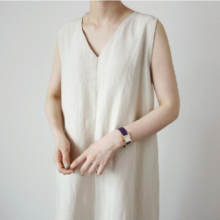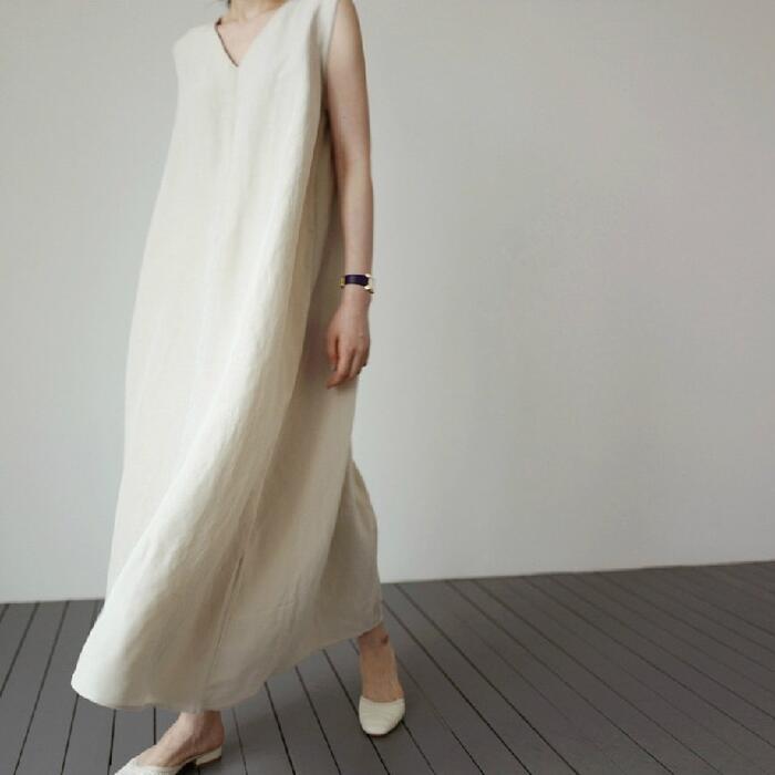 無駄のないシンプルなデザインのノースリーブワンピース。
