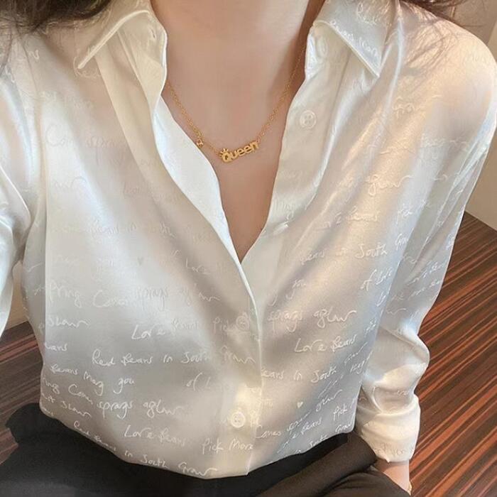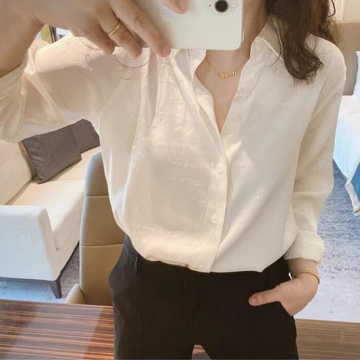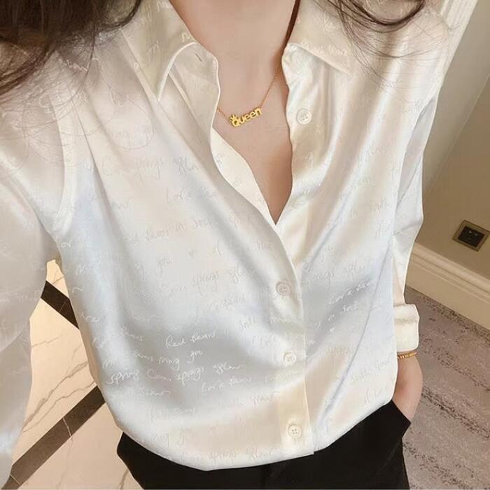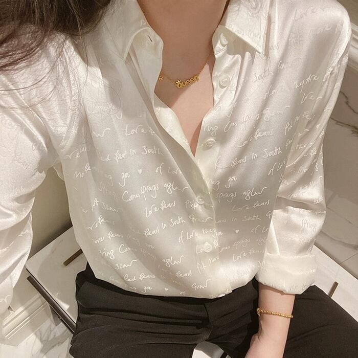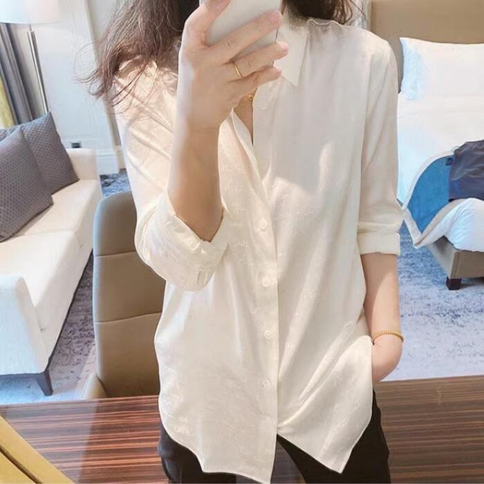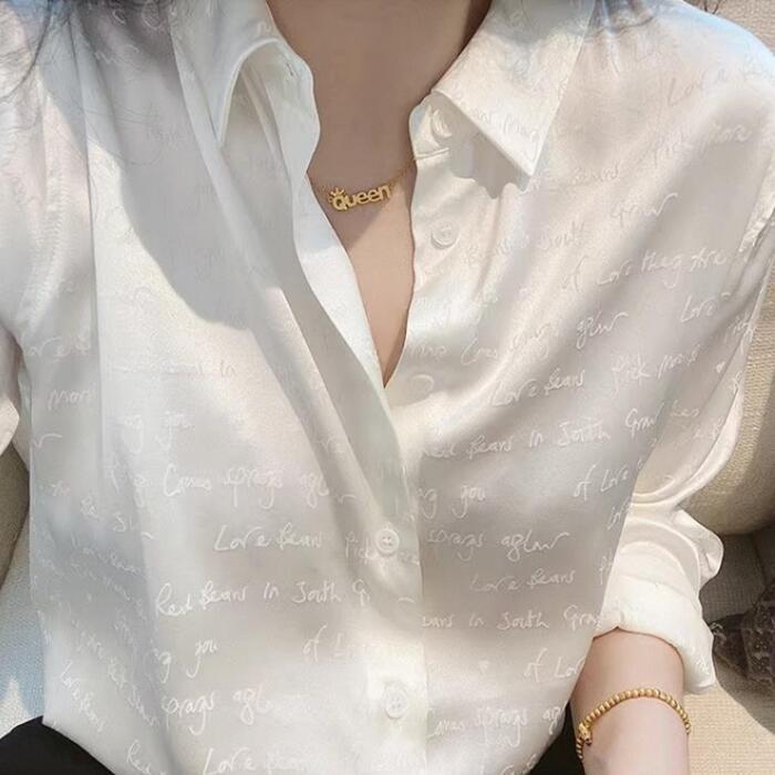 トップス シャツ ブラウス プリント ロゴ レディース エレガント きれいめ カジュアル フェミニン 大人 可愛い 長袖 体型カバー シンプル ゆったり 通勤 オフィス 大きいサイズ ホワイト 白 春 秋 夏 20代 30代 40代 50代