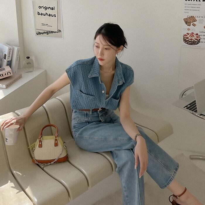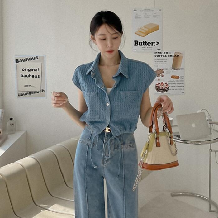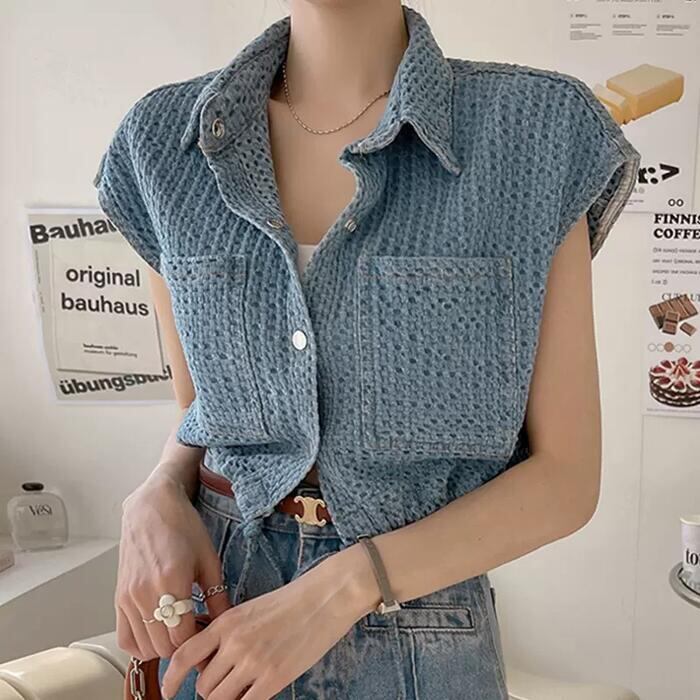 大きいサイズ ジャケット トップス シャツ ブラウス デニム レディース エレガント きれいめ カジュアル フェミニン 大人 可愛い 半袖 フレンチスリーブ 体型カバー シンプル ショート丈 レイヤード 重ね着 青 ブルー 春 秋 夏 20代 30代 40代 50代