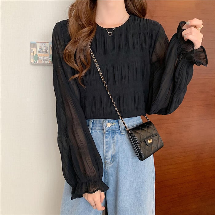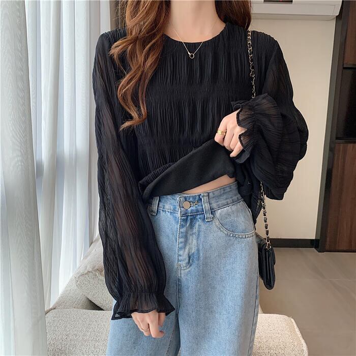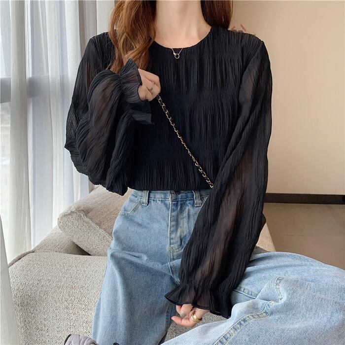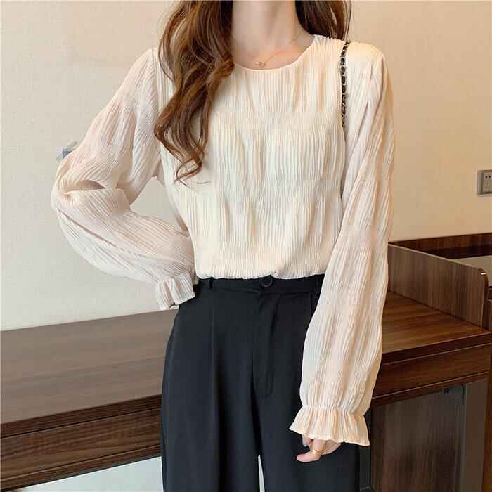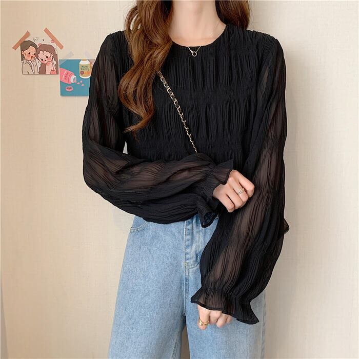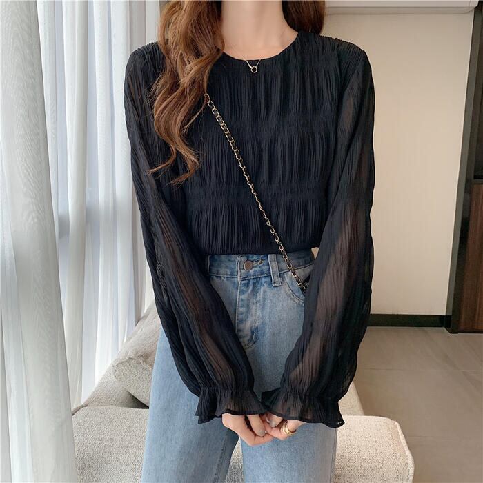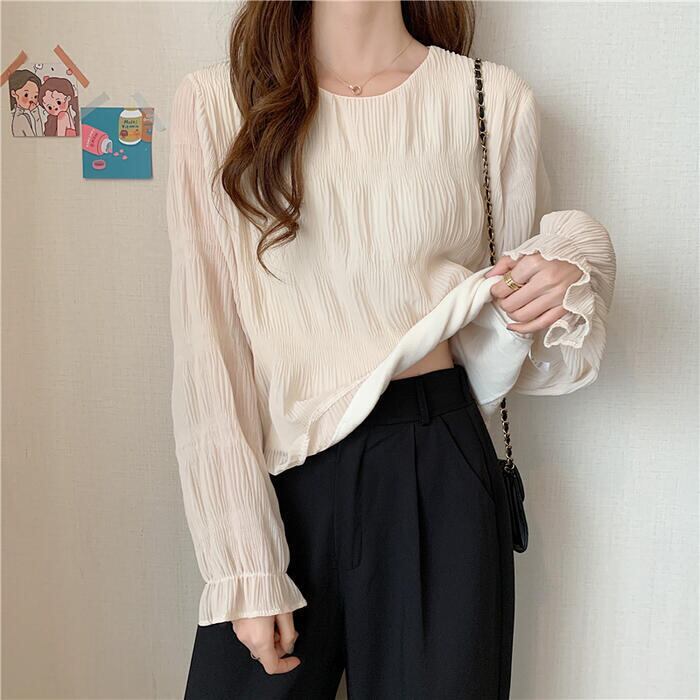 全2色 大きいサイズ トップス シャツ ブラウス Tシャツ プルオーバー レディース エレガント きれいめ カジュアル フェミニン 大人 可愛い 長袖 シワ加工 体型カバー シンプル ゆったり 無地 透け感 通勤 オフィス ベージュ ブラック 黒 春 秋 夏 20代 30代 40代 50代