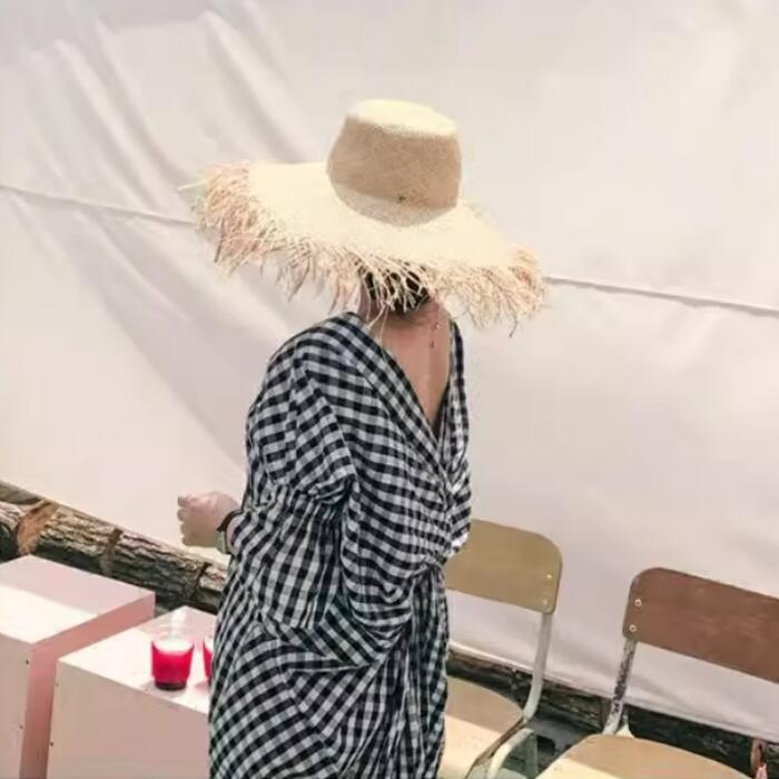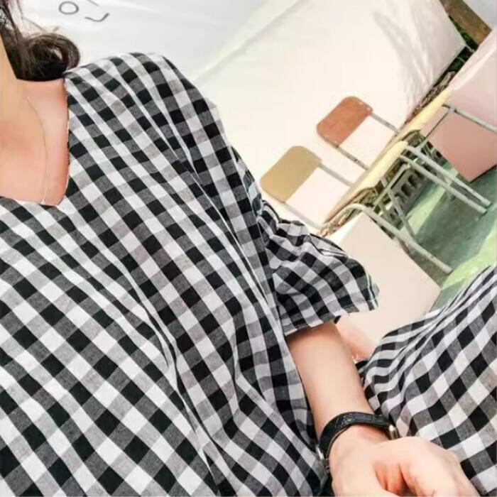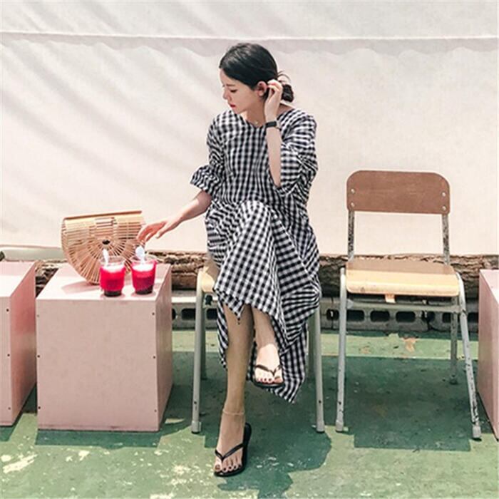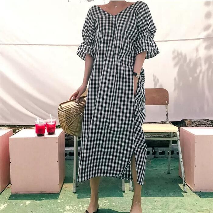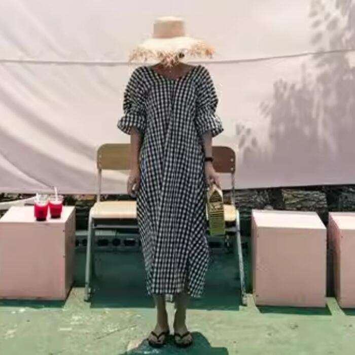 体型カバー 大きいサイズ ゆったり ワンピース ワンピ ドレス ギンガムチェック レディース エレガント きれいめ カジュアル バックシャン 五分袖 大人 可愛い フェミニン Aライン ミモレ丈 涼しい 肌見せ リラックス ブラック 黒 春 秋 夏 20代 30代 40代 50代