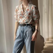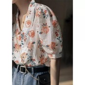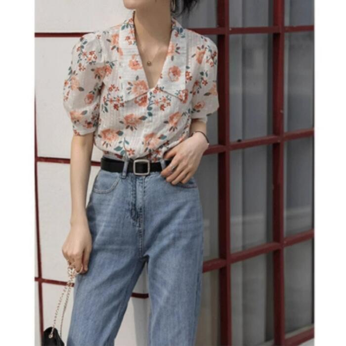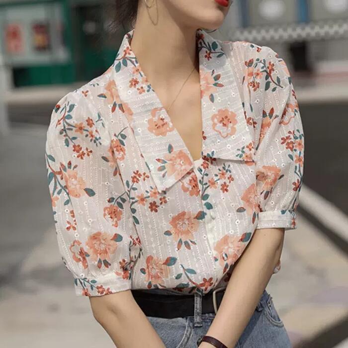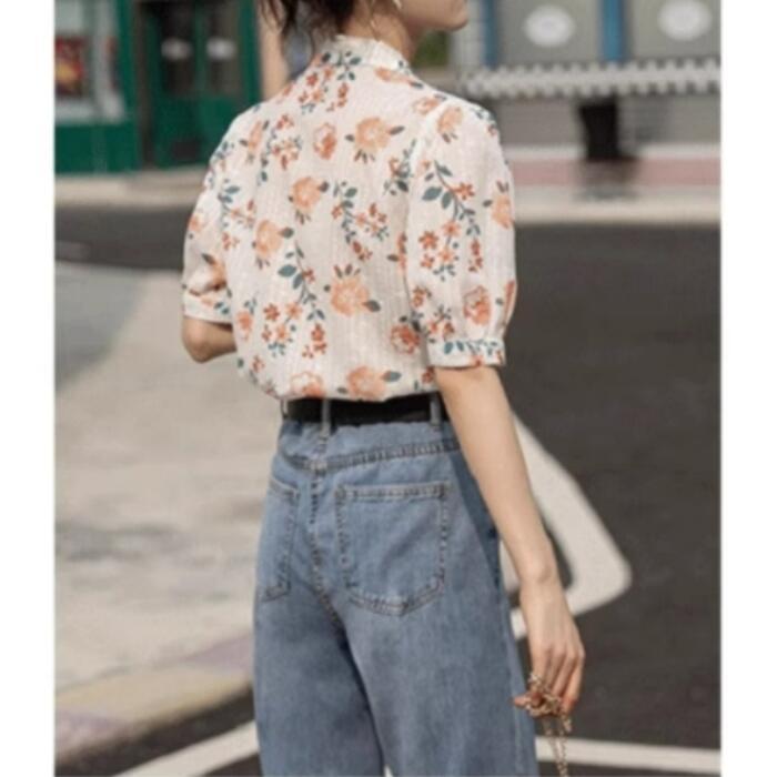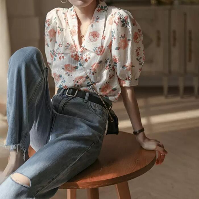 パフスリーブ トップス シャツ ブラウス 花柄 フラワー ボタニカル レディース エレガント きれいめ カジュアル フェミニン 大人 可愛い 五分袖 Vネック 体型カバー ショート丈 涼しい ナチュラル クラシカル ホワイト 白 春 秋 夏 20代 30代 40代 50代