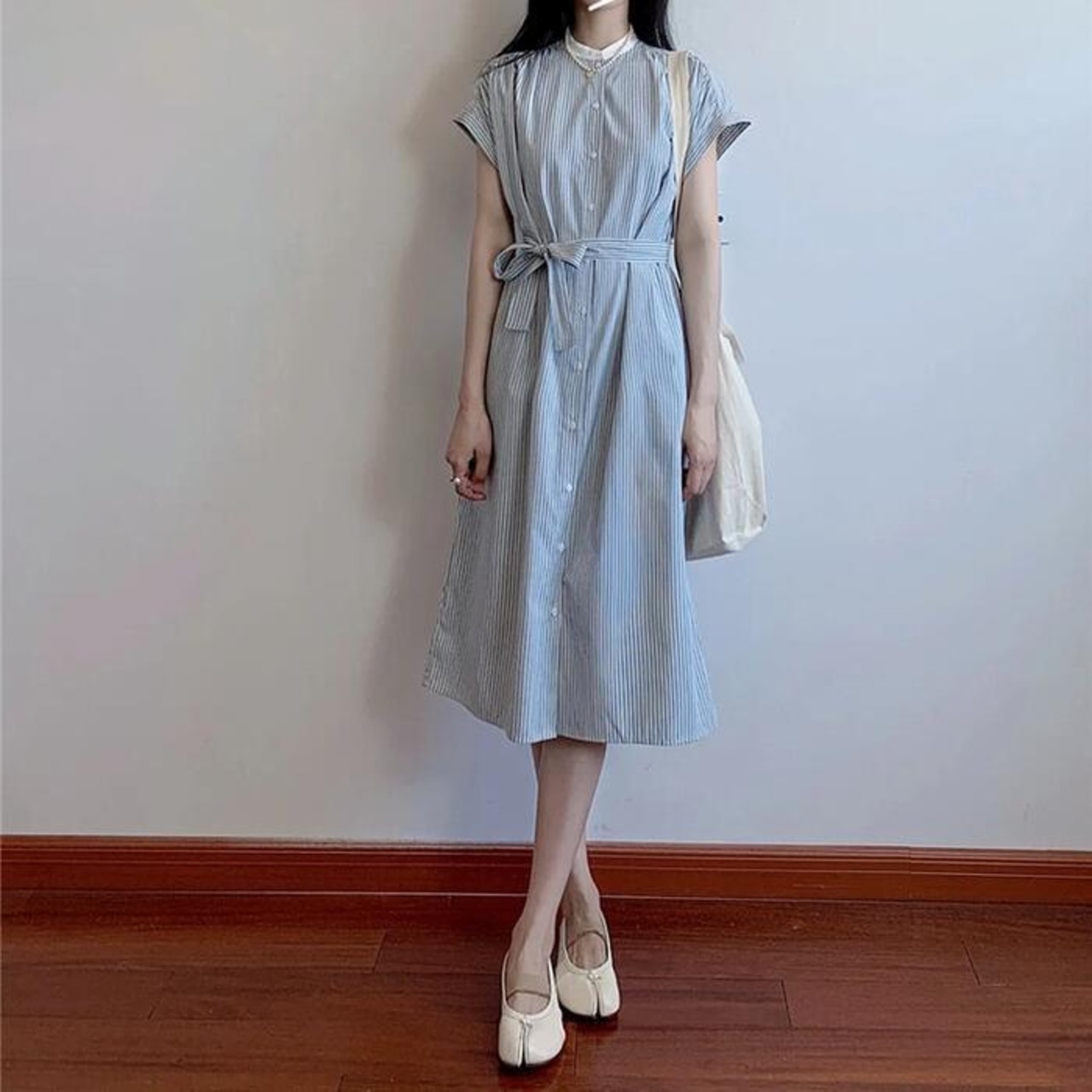 大きいサイズ ワンピース ワンピ ドレス ストライプ シャツワンピ レディース エレガント きれいめ カジュアル 半袖 大人 可愛い フェミニン Aライン ミディ丈 ゆったり 体型カバー ウエストリボン ナチュラル 通勤 グレー 春 秋 夏 20代 30代 40代 50代