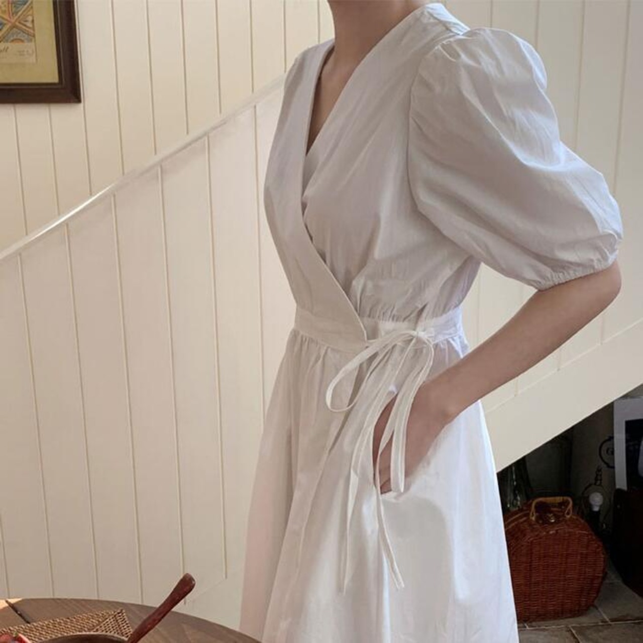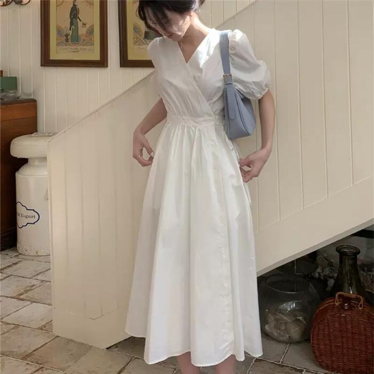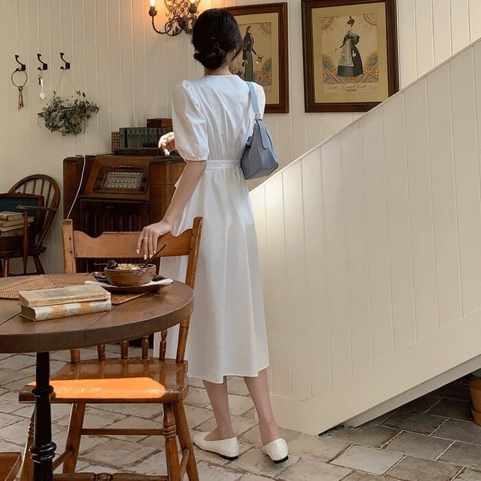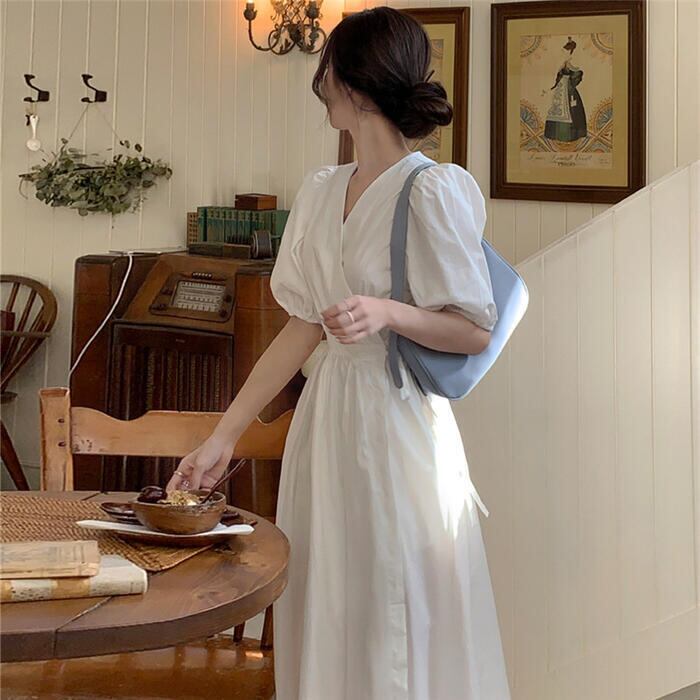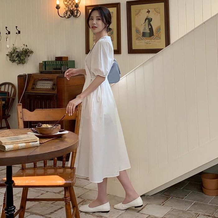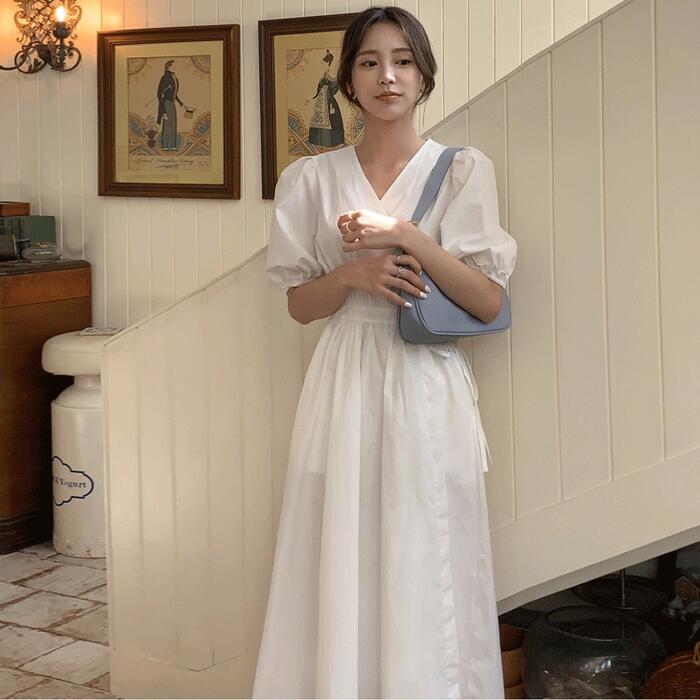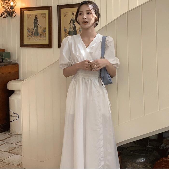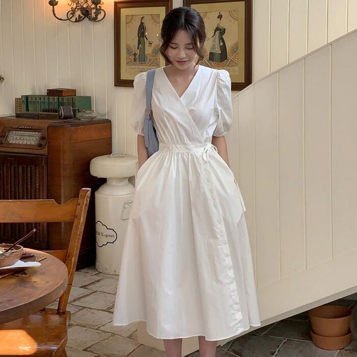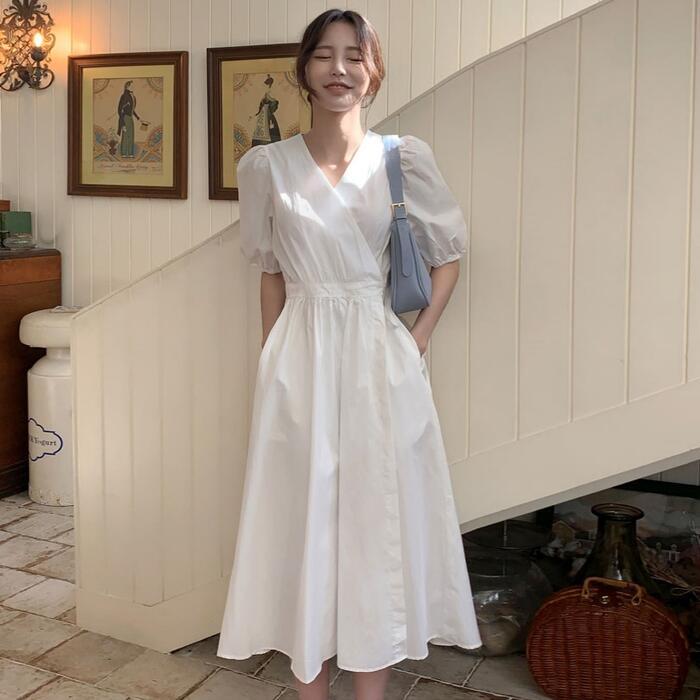 大きいサイズ ワンピース ワンピ ドレス カシュクール レディース エレガント きれいめ カジュアル 半袖 大人 可愛い フェミニン パフスリーブ Aライン ミモレ丈 Vネック 体型カバー ナチュラル シンプル ホワイト 白 春 秋 夏 20代 30代 40代 50代