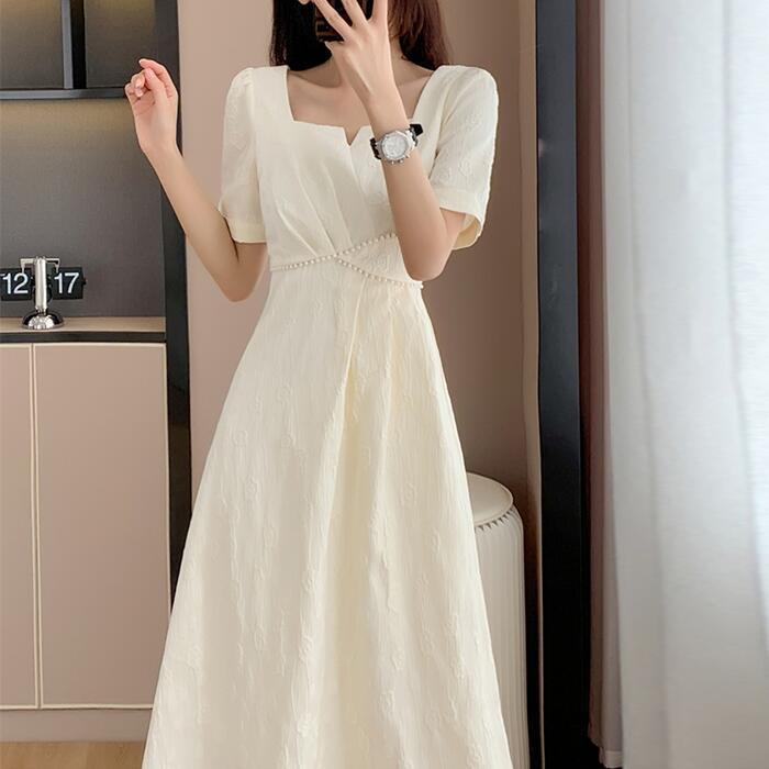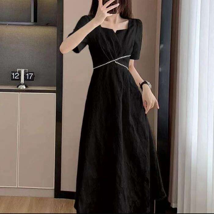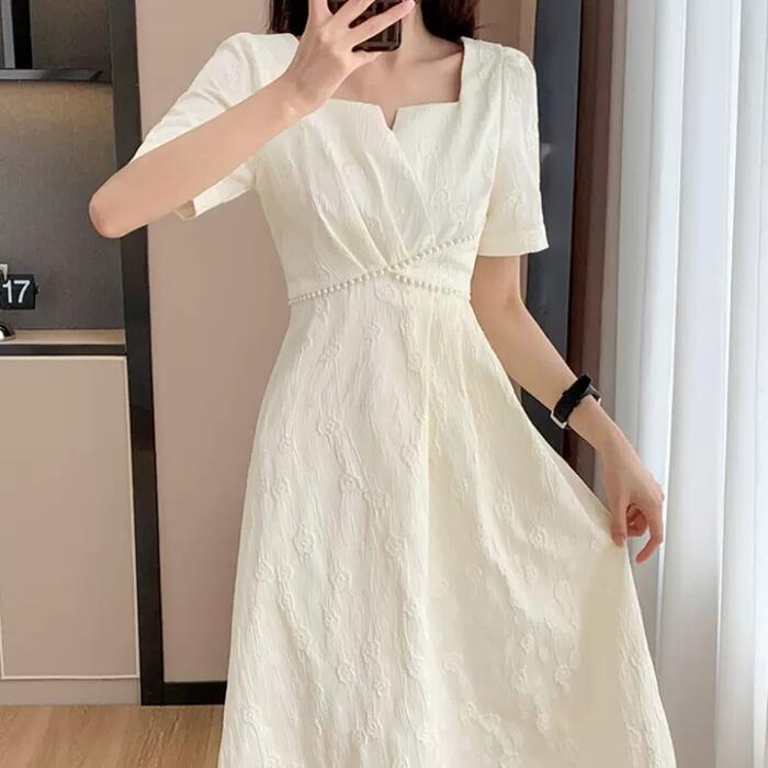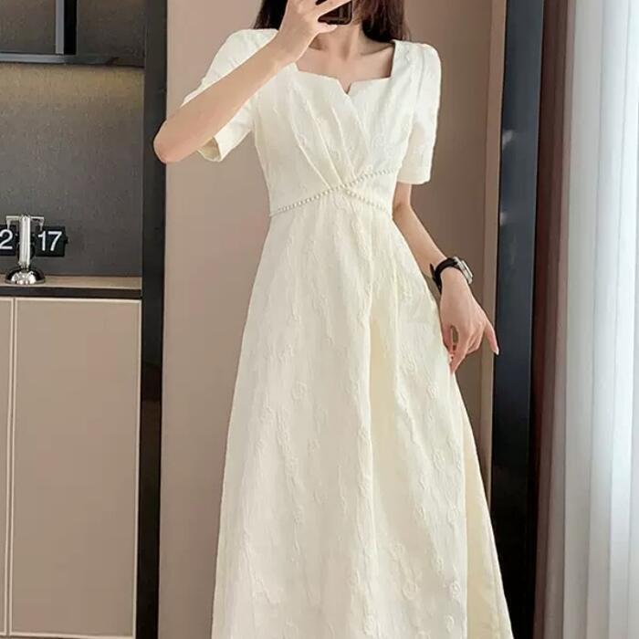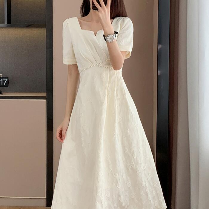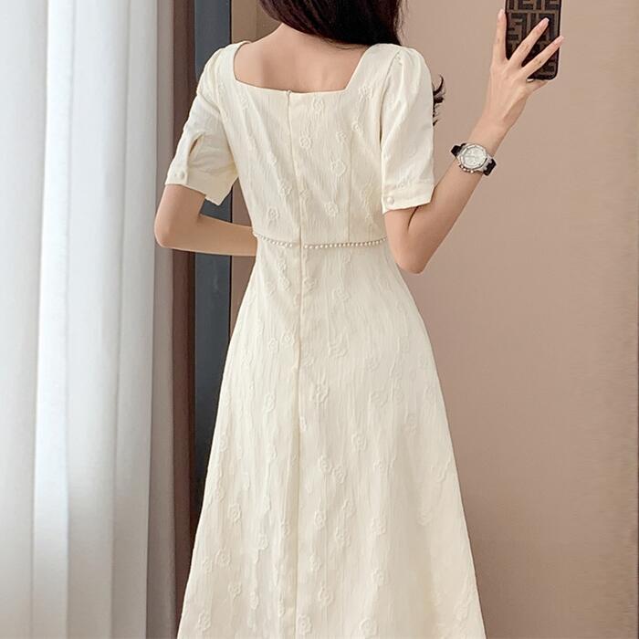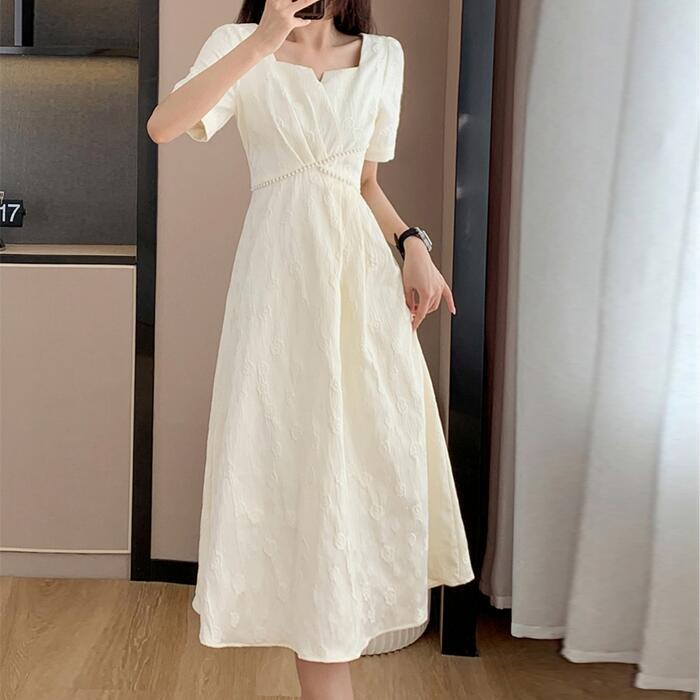 全2色 大きいサイズ 結婚式 ワンピース ワンピ ドレス 袖あり レディース エレガント きれいめ カジュアル 半袖 大人 可愛い フェミニン Aライン ミモレ丈 スクエアネック パール 花柄 お呼ばれ オケージョン ホワイト 白 ブラック 黒 春 秋 夏 20代 30代 40代 50代