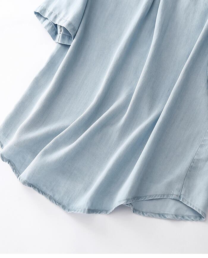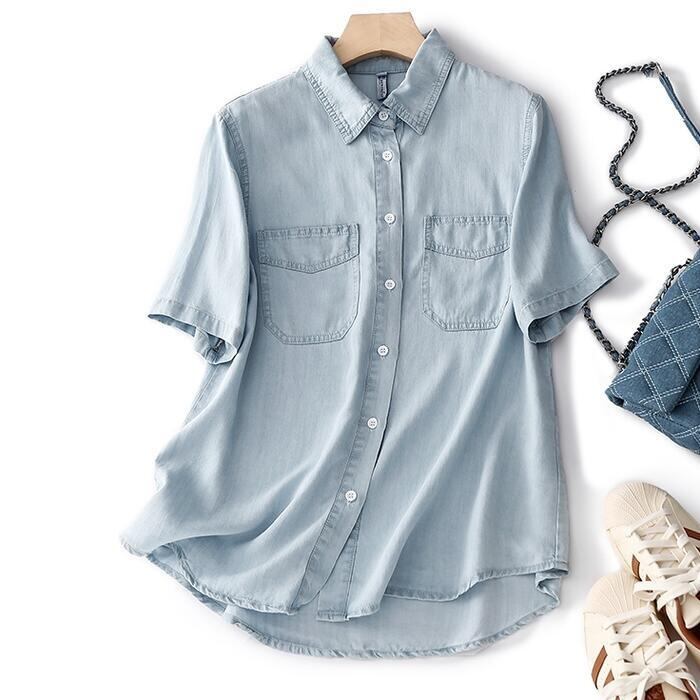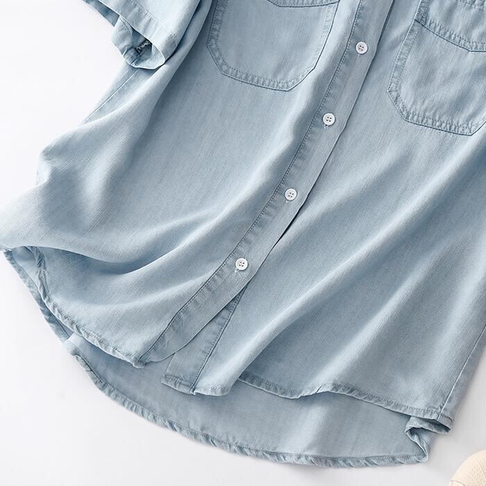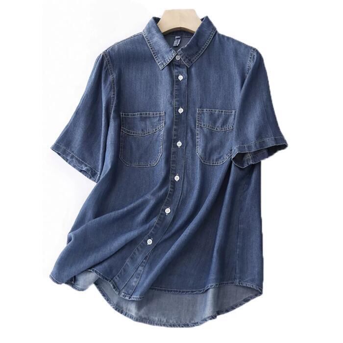 全2色 トップス シャツ ブラウス デニム ダンガリー 羽織り レディース きれいめ カジュアル フェミニン 大人 可愛い 半袖 体型カバー シンプル ベーシック 無地 楽ちん 大きいサイズ 青 ブルー 春 秋 夏 20代 30代 40代 50代