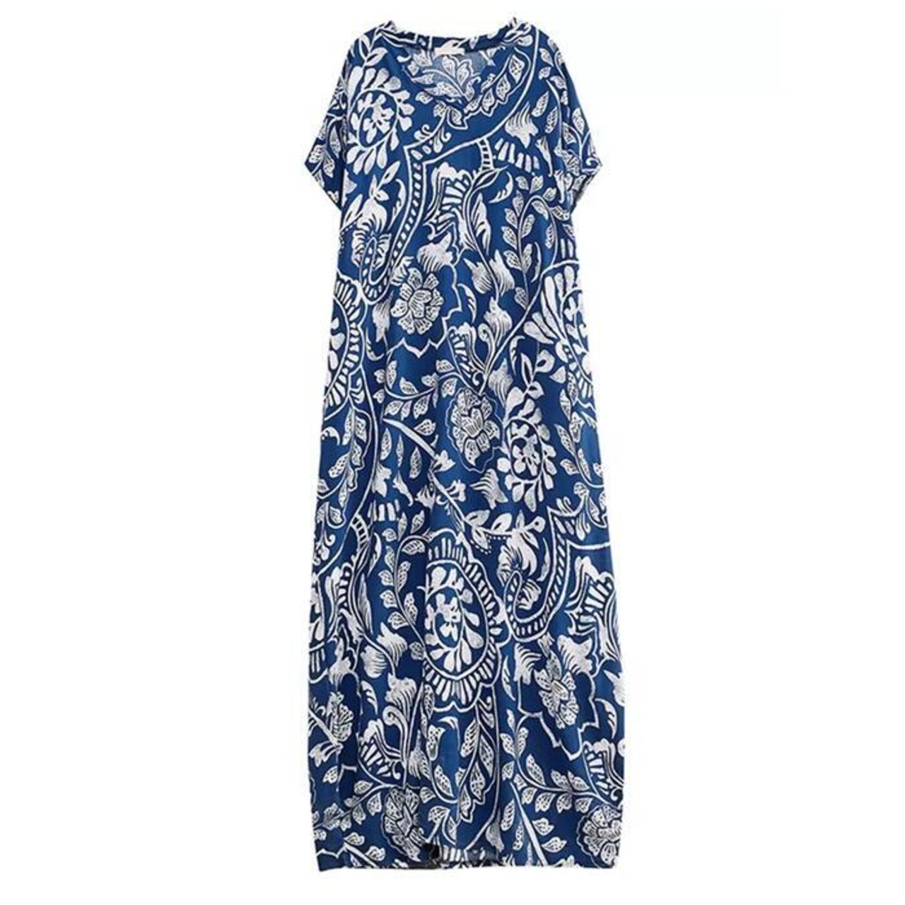 体型カバー ワンピース ワンピ ドレス プリント ボタニカル レディース エレガント きれいめ カジュアル 半袖 大人 可愛い フェミニン Aライン ロング丈 マキシ丈 ゆったり リゾート リラックス ナチュラル ブルー 青 ネイビー 春 秋 夏 20代 30代 40代 50代