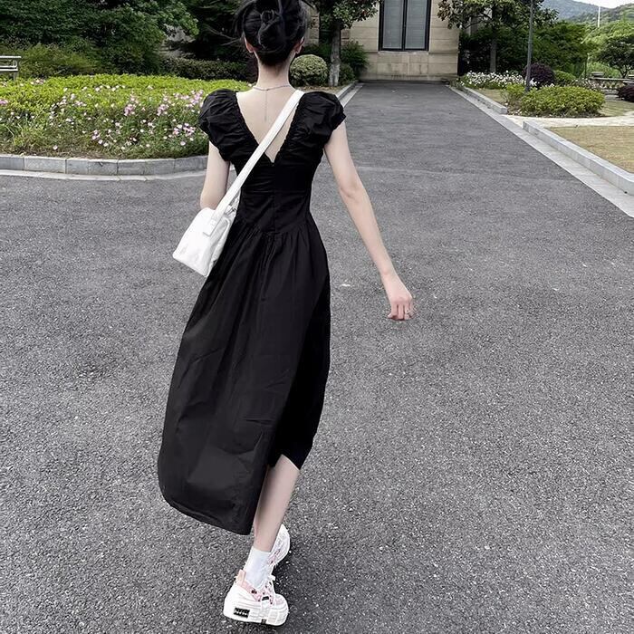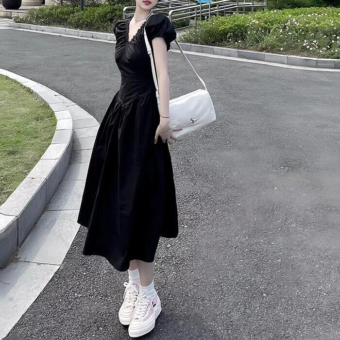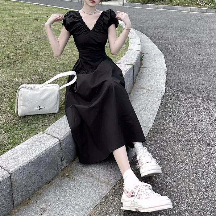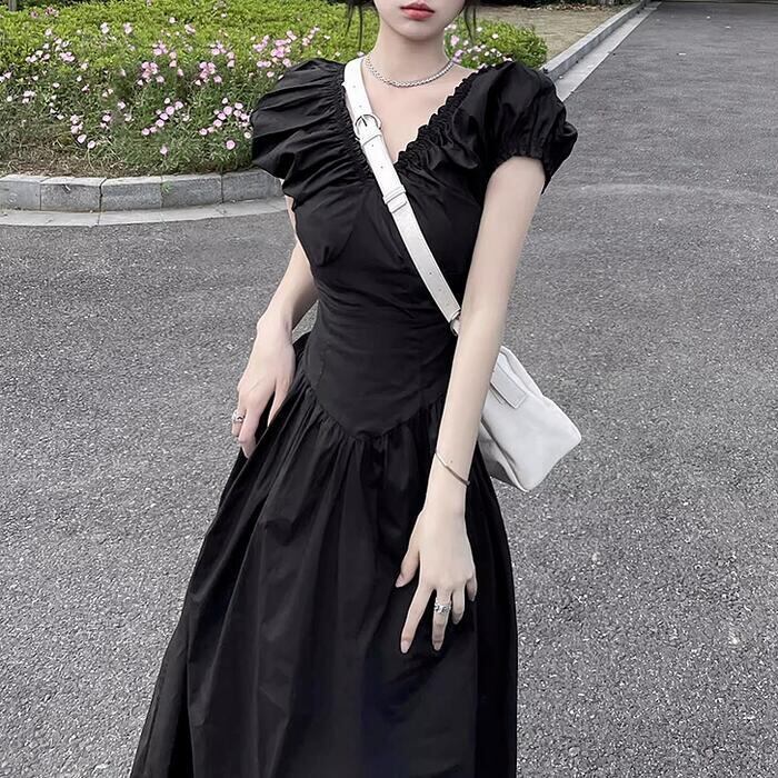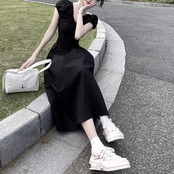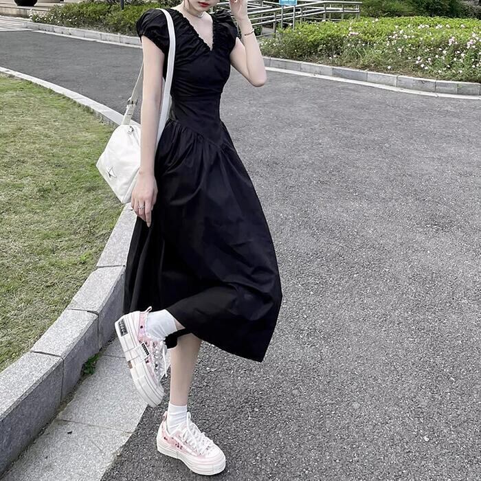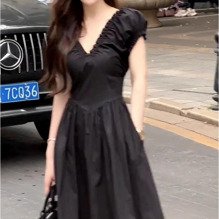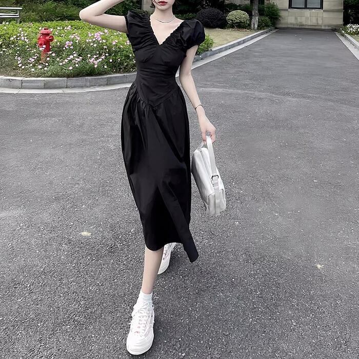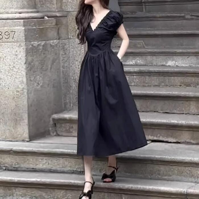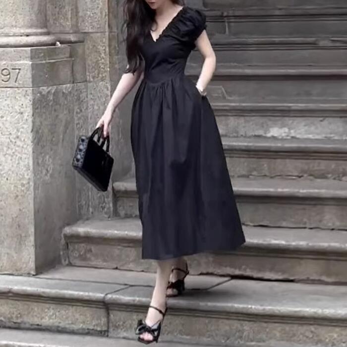 大きいサイズ ワンピース ワンピ ドレス レディース エレガント きれいめ カジュアル 半袖 大人 可愛い フェミニン Aライン ミモレ丈 Vネック 切り替え 上品 オケージョン お呼ばれ シンプル 体型カバー ハイウエスト ブラック 黒 春 秋 夏 20代 30代 40代 50代